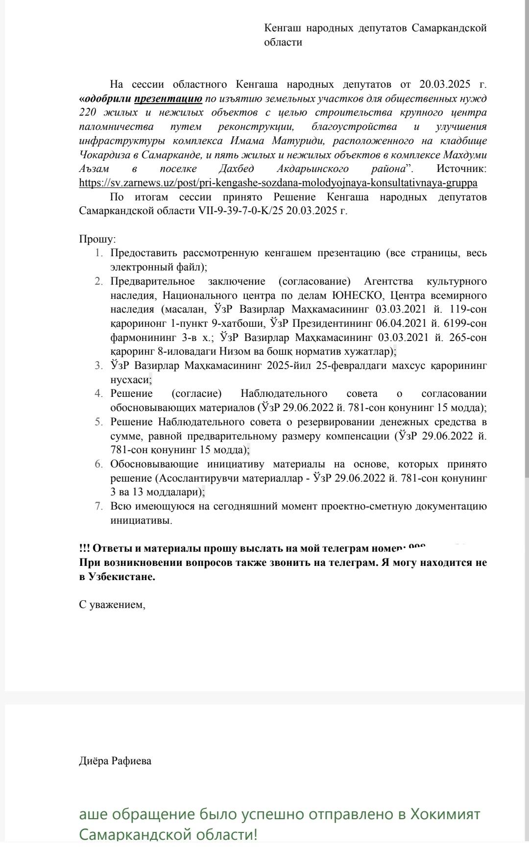 «Кенгаш Самаркандской области обосновывает изъятие земли и снос недвижимости 225 собственников (граждан и юридических лиц) на основе некоего «особого» постановления Кабинета Министров (ЎзР Вазирлар Маҳкамасининг 2025-йил 25-февралдаги махсус қарори), в котором не указаны номер и другие данные официального документа. Что это за «особое решение»?!