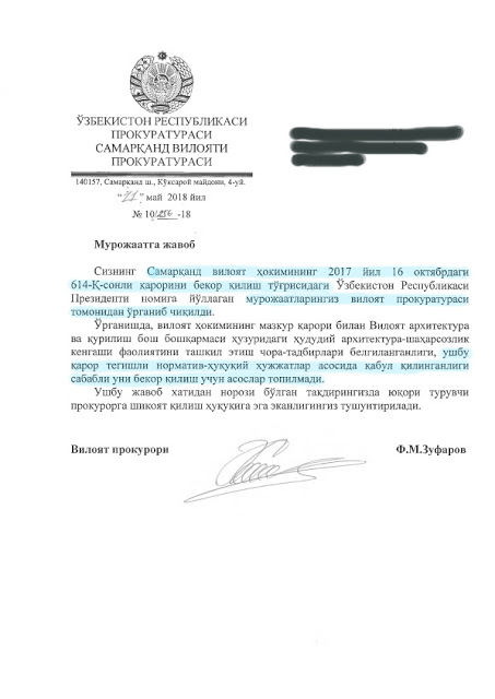 Лживый ответ областного прокурора Зуфарова о законности указа хокима