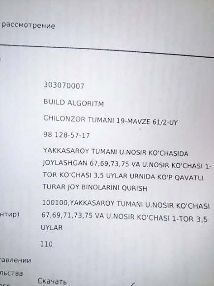 Три недели назад я отнесла письмо (я домком) в приемную президента в здании Яккасарайского собеса. 18-го апреля меня вызвали в Яккасарайский районный хокимият. Тимур Магруфов из строительного отдела стал объяснять, как собираются документы на стройку здания, стал уверять, что у них всё в норме. Потом предложил созвать собрание жильцов и застройщика. Которое так и не состоялось!