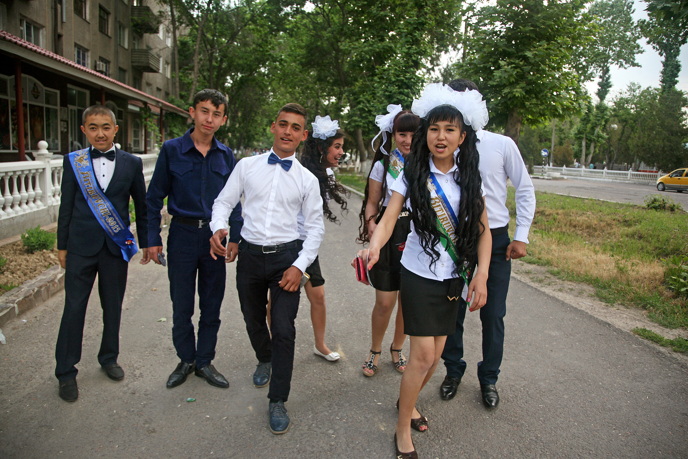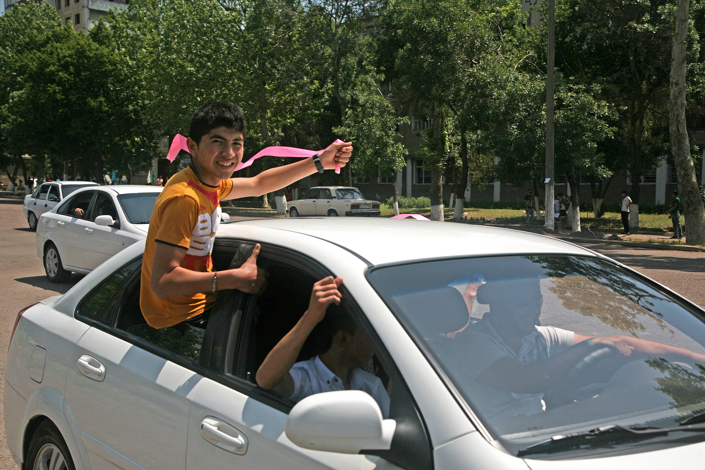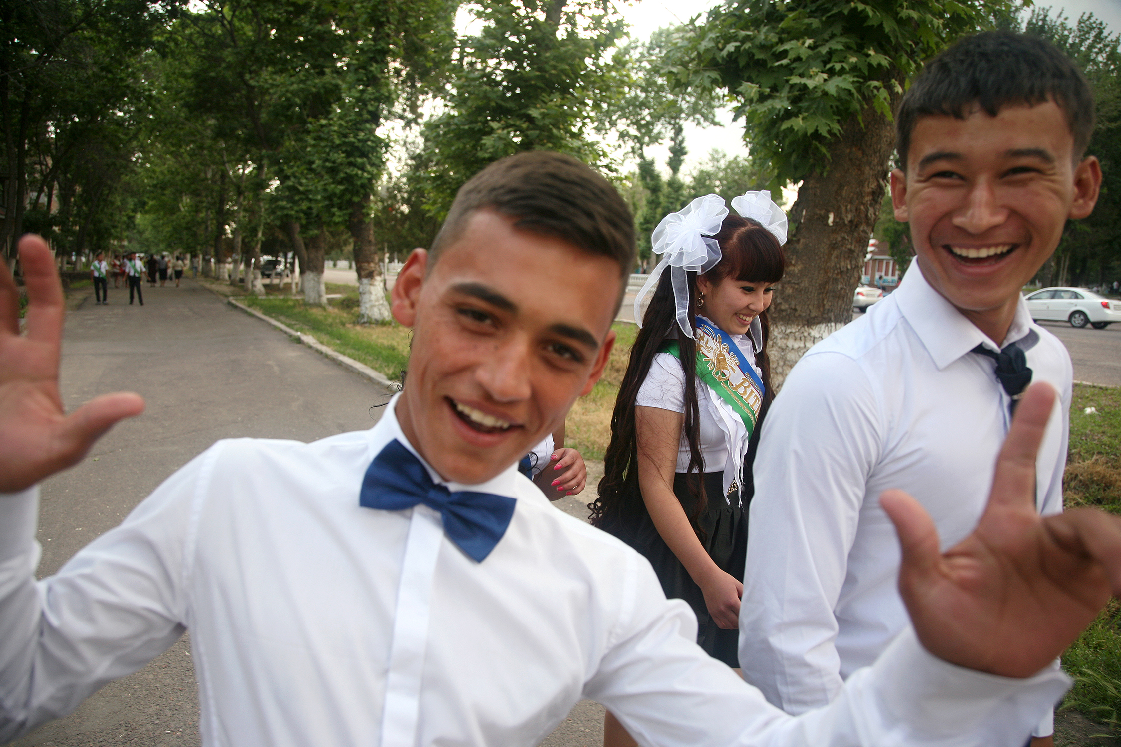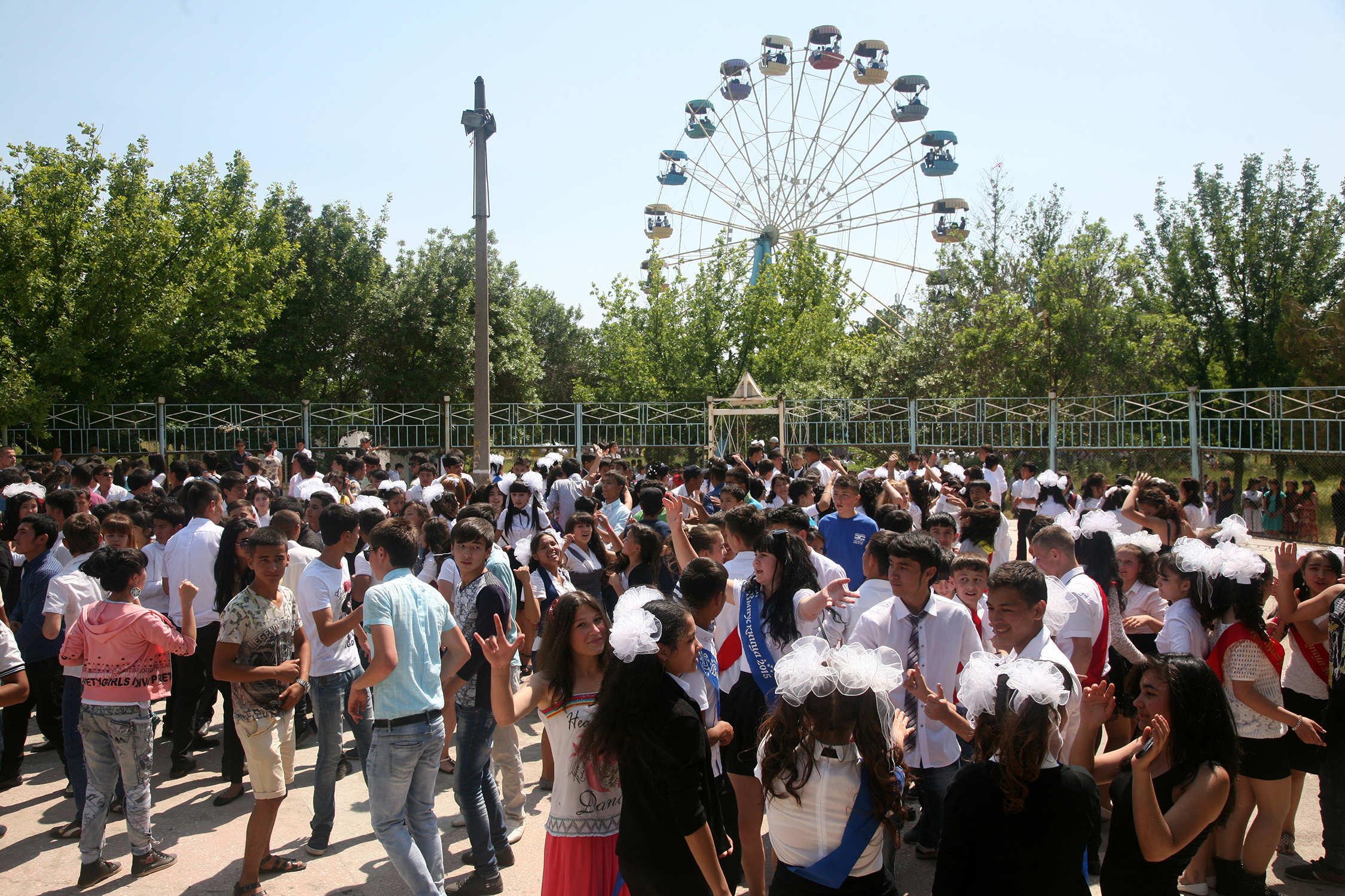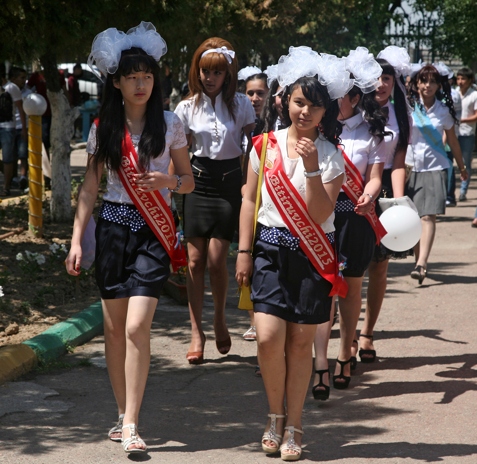 По окончании занятий бывшие ученики школ, лицеев и колледжей направились в городской парк (а всего в городе более сорока школ, не считая прочих учебных заведений). У многих поперек груди были ленты с надписями на узбекском и русском «Выпускник-2015».
