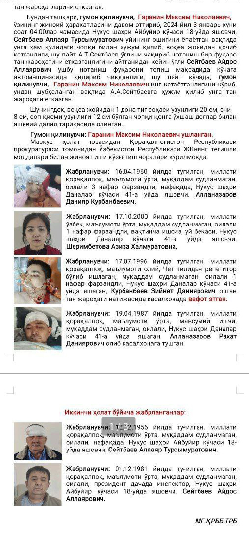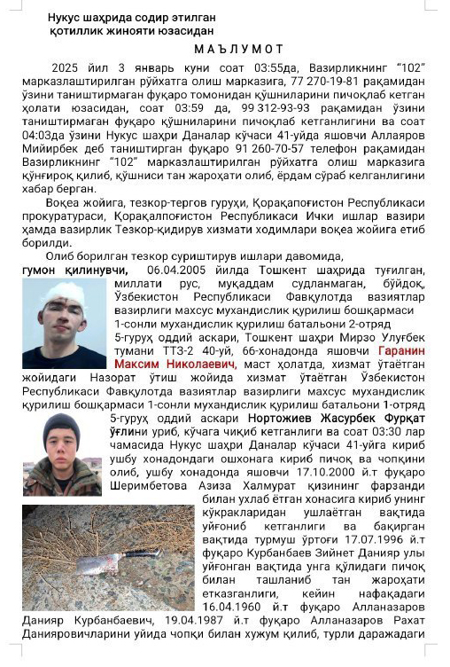 Вскоре по подозрению в совершении преступлений был задержан рядовой срочной службы 5-ой группы 2-го отряда 1-го инженерно-строительного батальона Специального инженерно-строительного управления МЧС Узбекистана Гаранин Максим Николаевич, родившийся 6 апреля 2005 года в Ташкенте. Согласно официальной версии, подозреваемый, находясь в нетрезвом состоянии, покинул территорию воинской части в Нукусе (возле Агаш-базара), применив силу к дежурившему на КПП рядовому МЧС Жасурбеку Нуртожиеву. Около 3:30 он проник в дом по адресу ул. Даналар, 41, где взял на кухне нож и тяпку и вошел в комнату спавшей вместе с ребенком 24-летней Азизы Ш., чтобы ее изнасиловать. Когда он схватил женщину за грудь, она закричала. На ее крики проснулся муж, репетитор английского языка 28-летний Зийнет Курбанов. Нападавший нанес ему удары ножом, от которых позднее потерпевший скончался в больнице. Затем Гаранин ранил отца погибшего - пенсионера Данияра Алланазарова, и его второго сына Рахата, проживавших в соседнем доме.