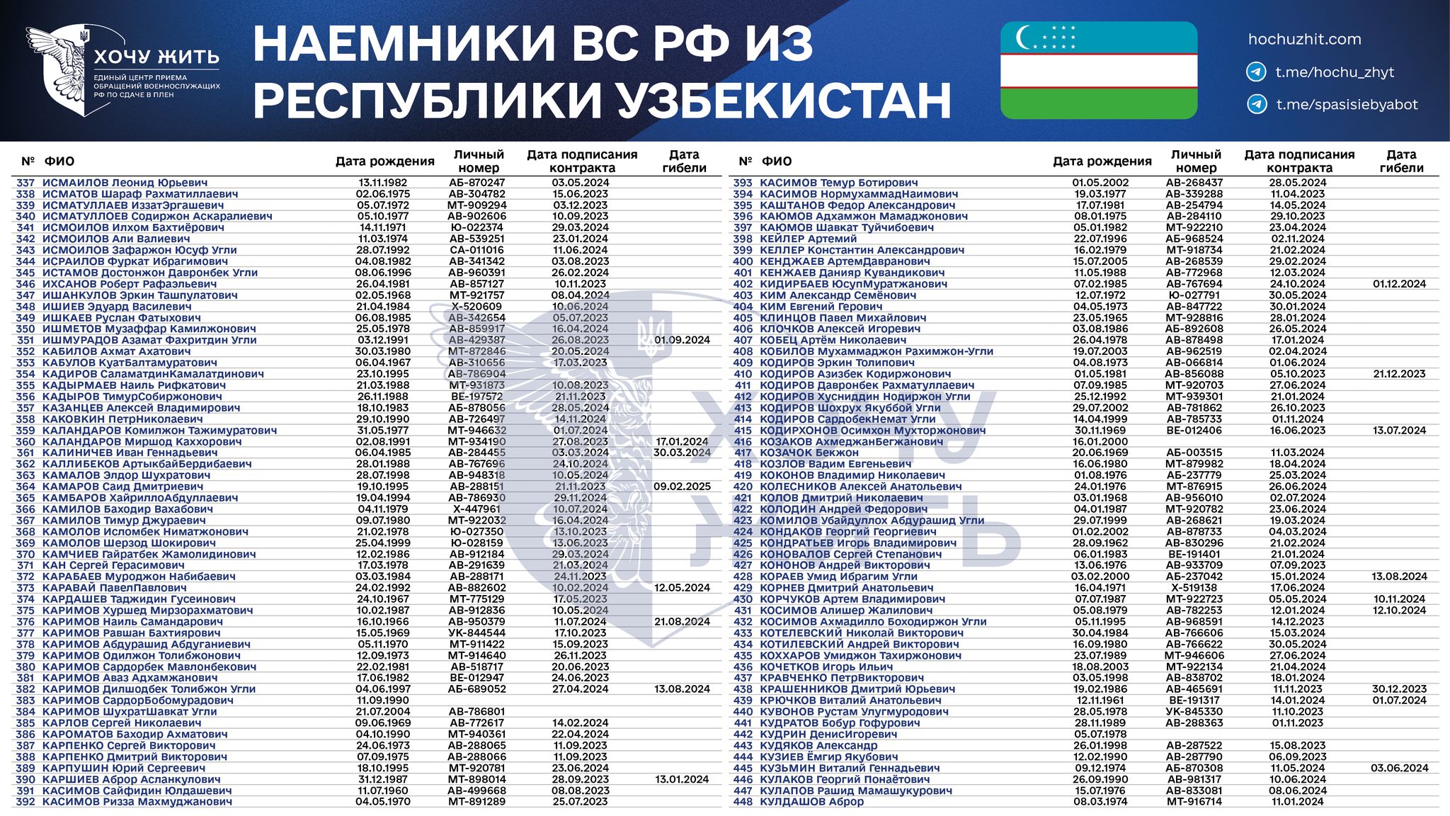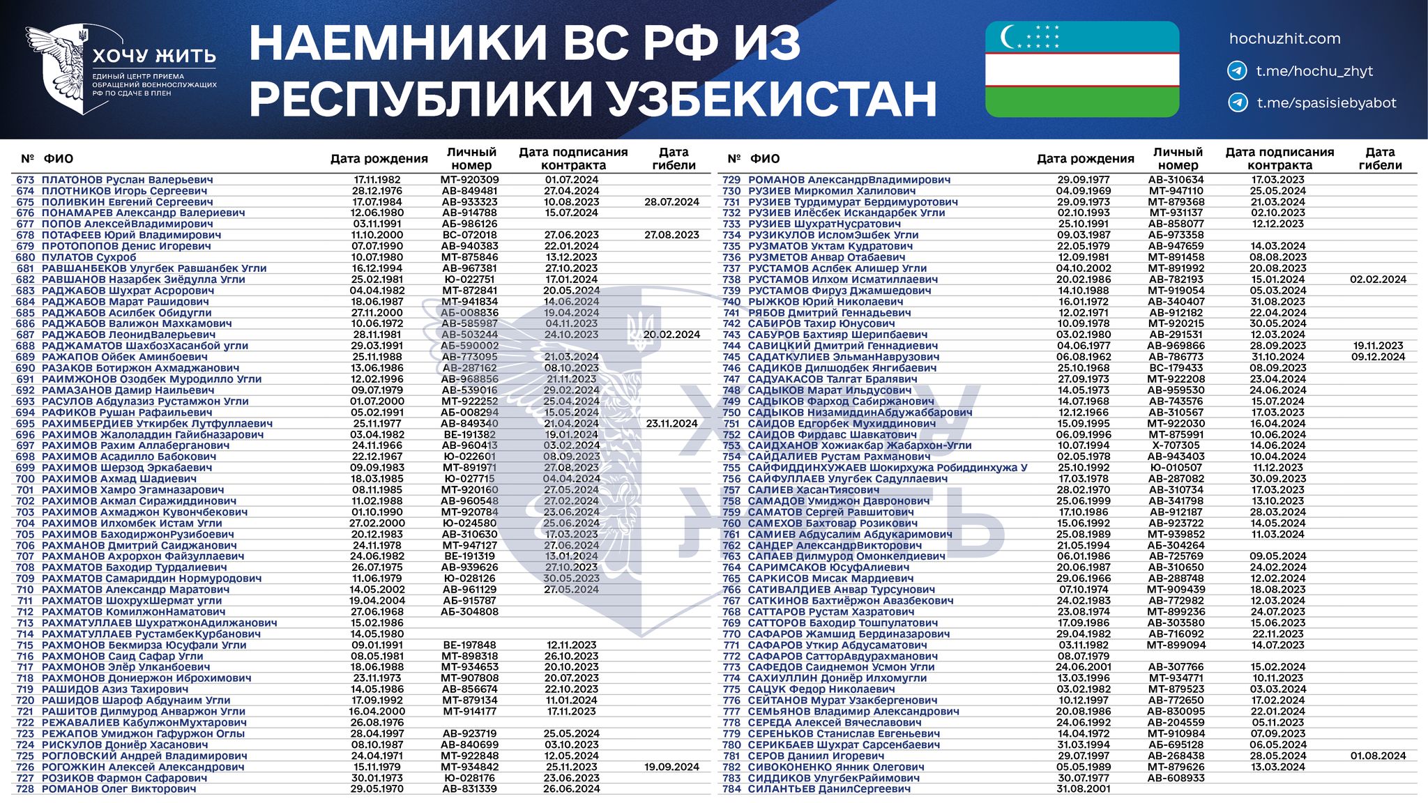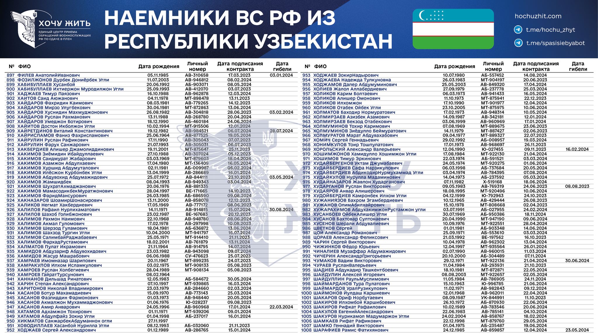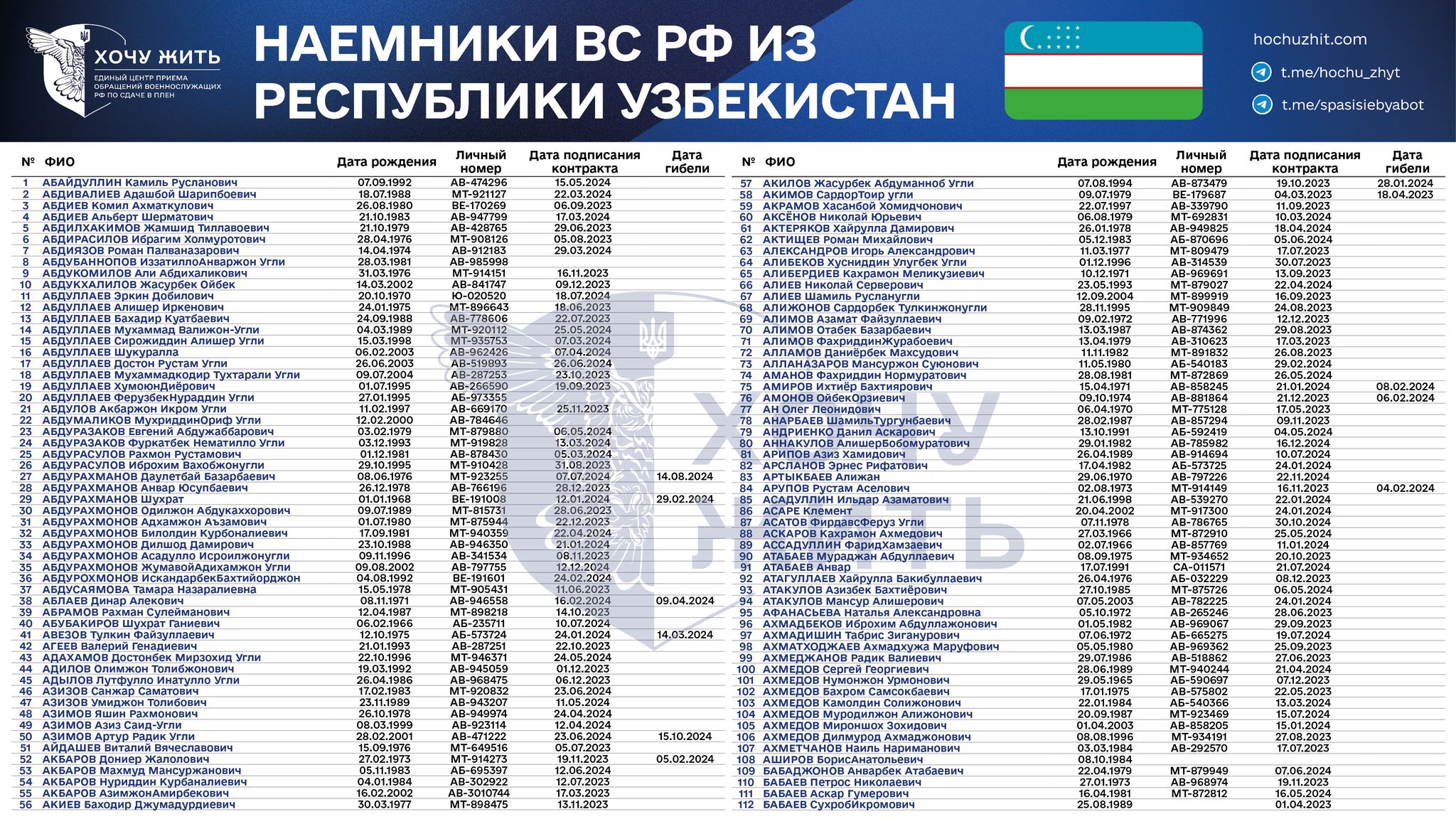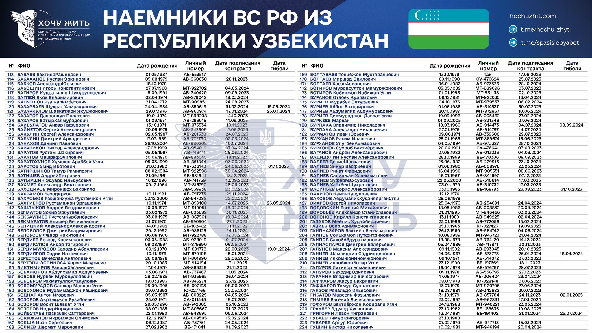 Из фигурирующих в списке узбекистанцев погибли как минимум 109 человек. Самому молодому из них был неполный 21 год, самому возрастному – 62 года. Один из наемников погиб на 8-й день после подписания контракта.