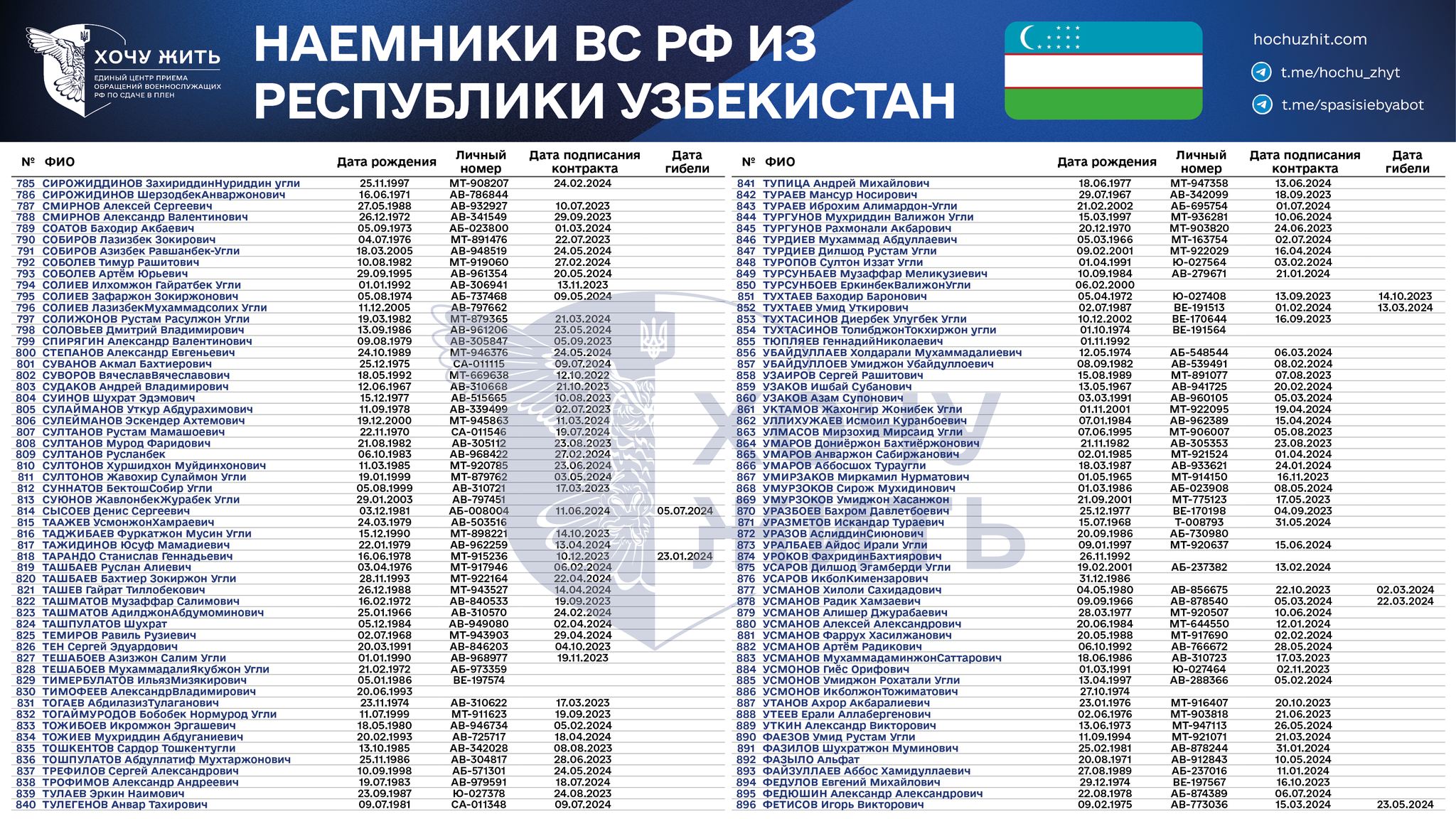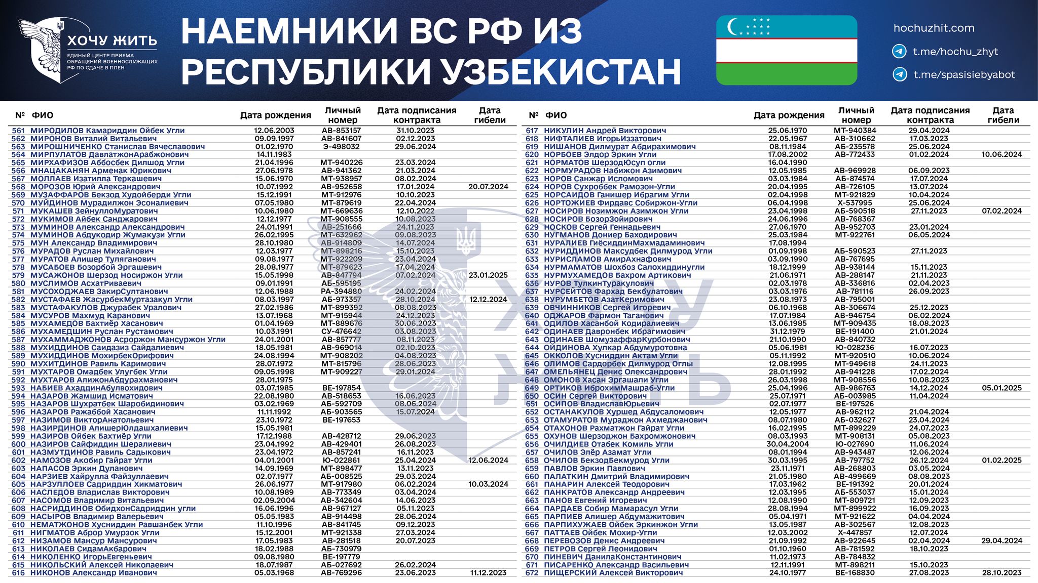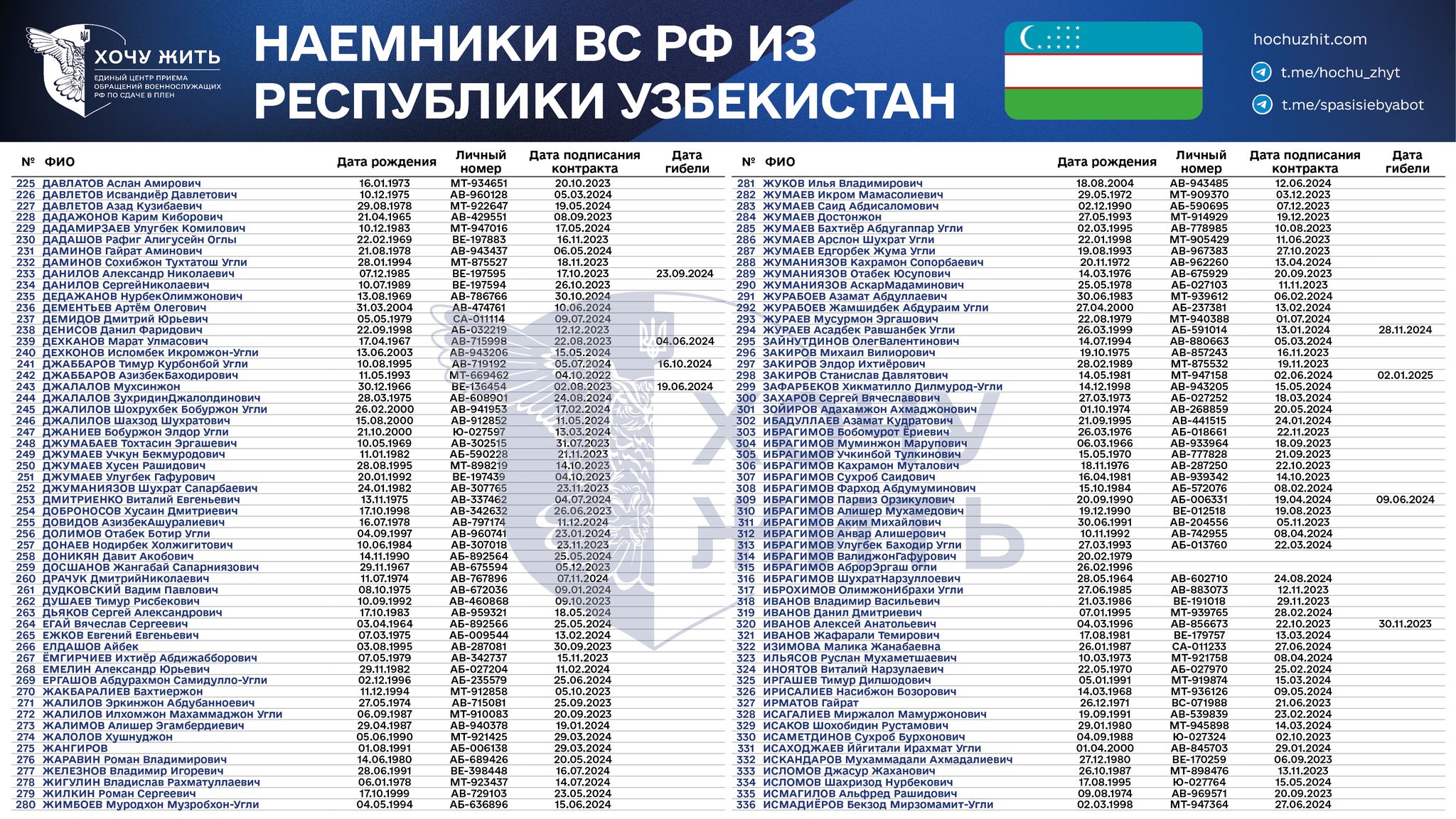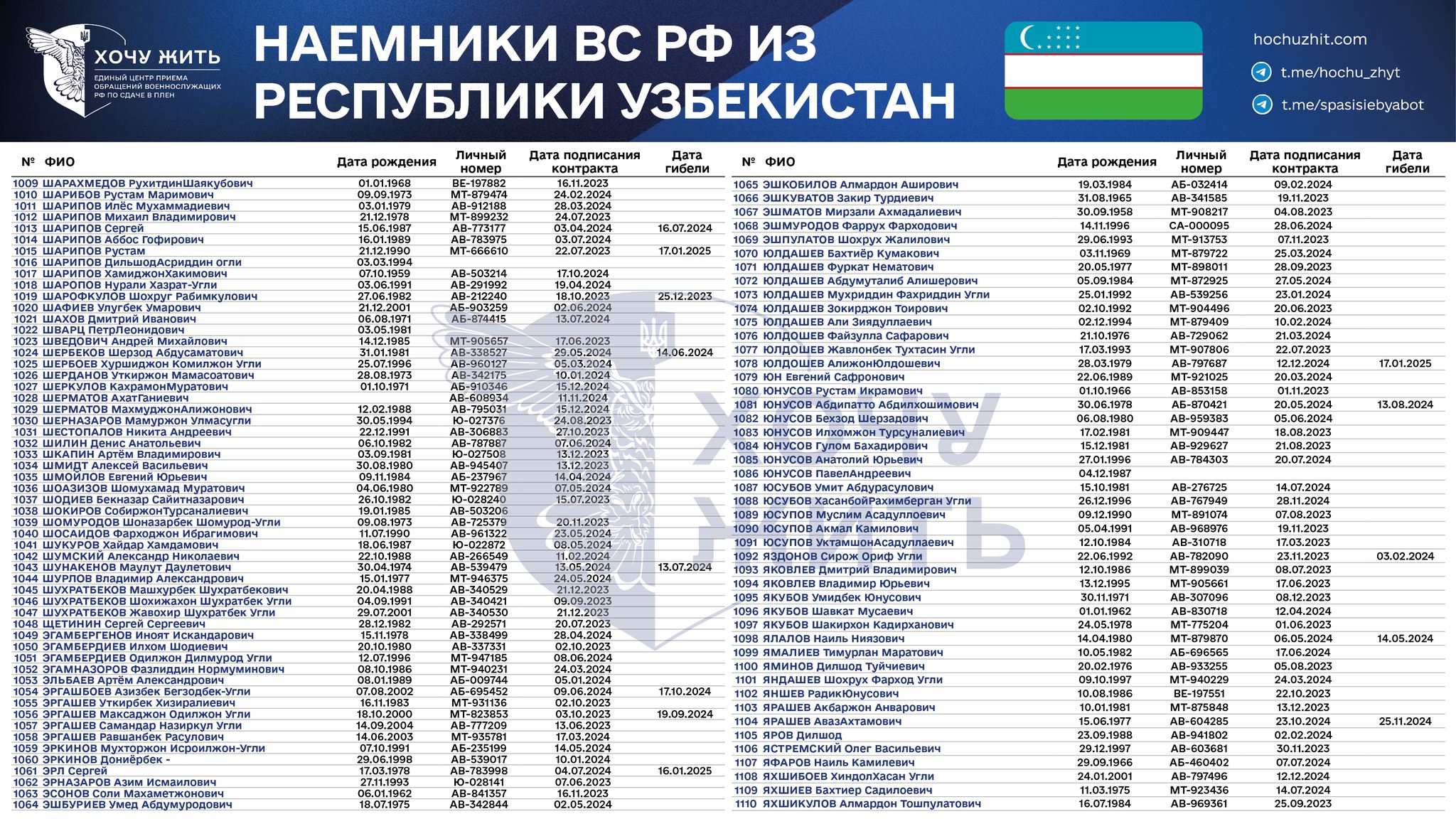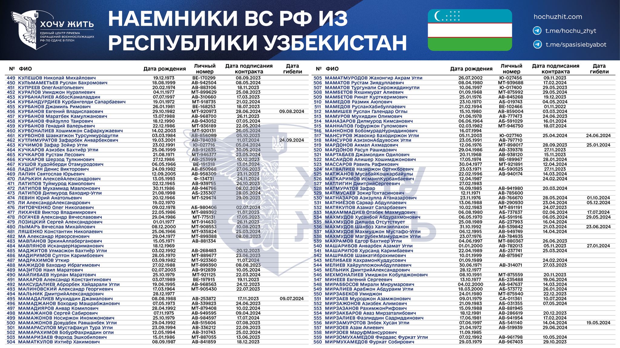 Из фигурирующих в списке узбекистанцев погибли как минимум 109 человек. Самому молодому из них был неполный 21 год, самому возрастному – 62 года. Один из наемников погиб на 8-й день после подписания контракта.