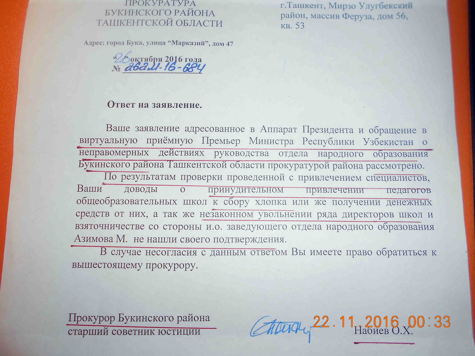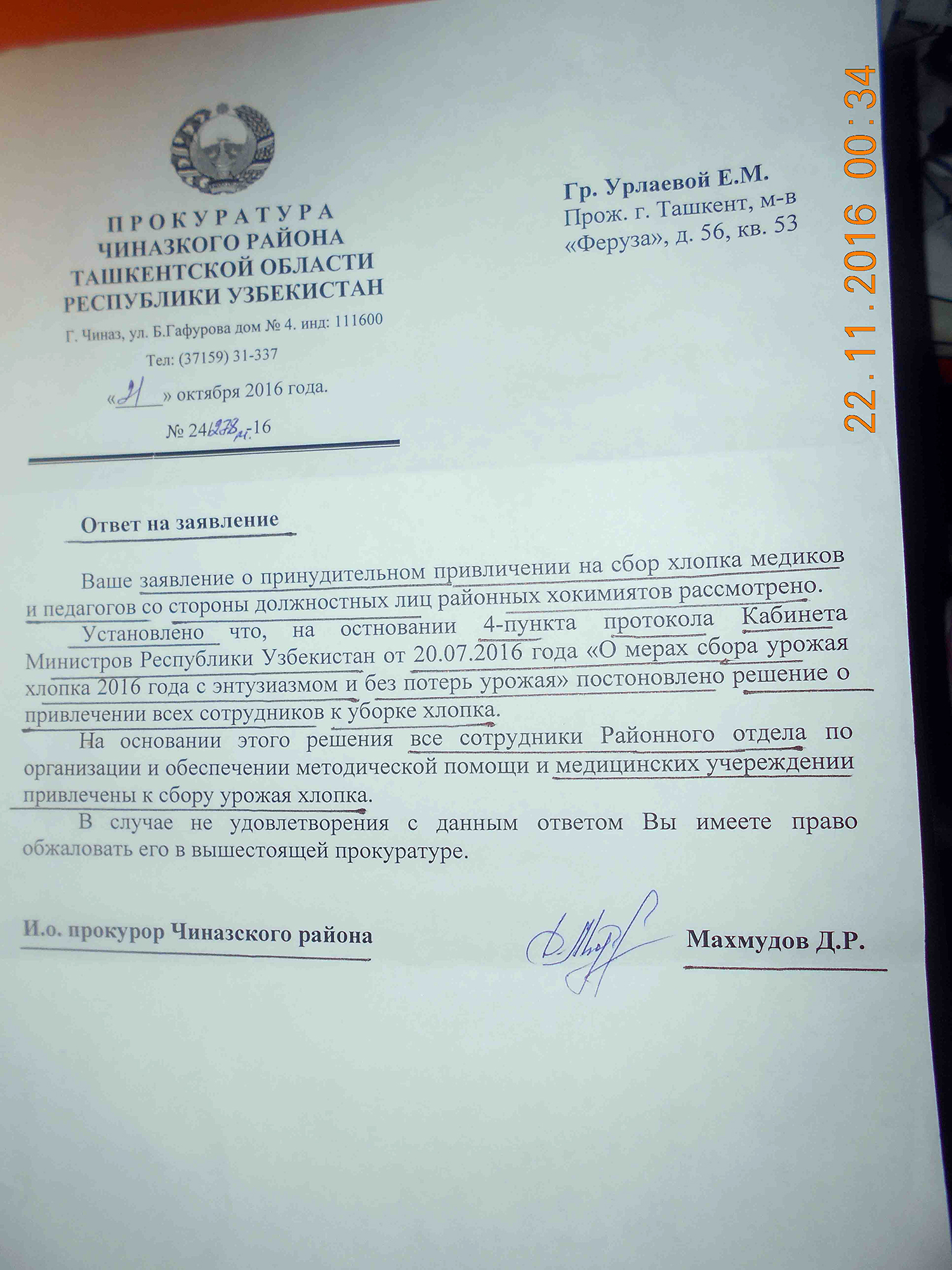 «Ваше заявление о принудительном привлечении на сбор хлопка медиков и педагогов со стороны должностных лиц районных хокимиятов рассмотрено.