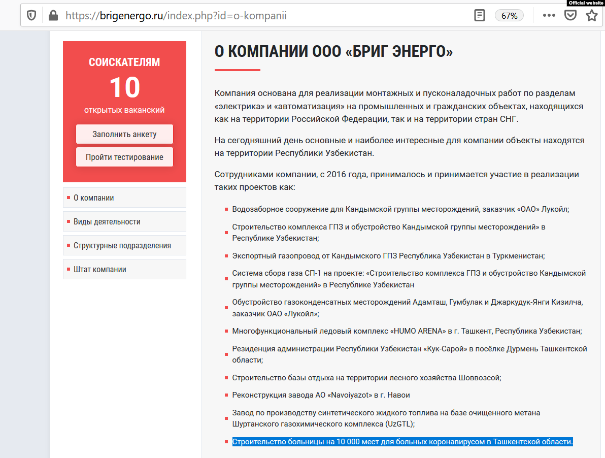 Brigenergo, обнародовавшая на своем сайте список осуществленных в 2020 году крупных проектов, сообщила также, что построила в Зангиатинском районе Ташкентской области больницу для ковидных пациентов на 10 тысяч коек.