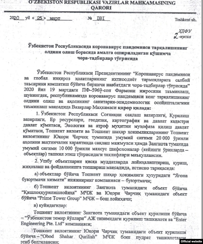 Постановление о строительстве карантинного центра в Юкоричирчикском (Верхнечирчикском – ред.) районе Ташкентской области вместимостью 20 тысяч мест и специальной больницы на 10 тысяч мест в Зангиате. Источник средств - государственный бюджет, точнее Антикризисный фонд.