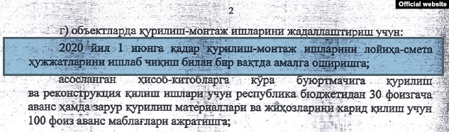 Согласно первому «исключению», было дано разрешение начать строительство объектов в Юкоричирчикском и Зангиатинском районах до завершения разработки проектно-сметной документации. Это, в свою очередь, позволяет подрядчикам менять по своему усмотрению цены на строительство до его начала и после подписания соглашения.