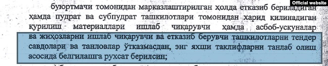 По второму «исключению», которое было легализировано постановлением Арипова, подрядчикам и субподрядчикам было разрешено без проведения тендерных торгов и конкурса покупать стройматериалы и оборудование у любой организации – на государственные деньги.