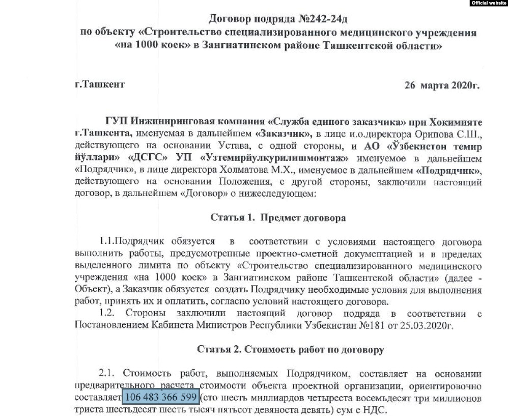 12 ноября 2020 года в дополнительных соглашениях, подписанных между инжиниринговой компанией мэра столицы Артыкходжаева «Ягона буюртмачи хизмати» и ООО «Узтемирйулкурилишмонтаж», стоимость строительства ковидной спецбольницы повышается до 320 827 215 000 сумов.
