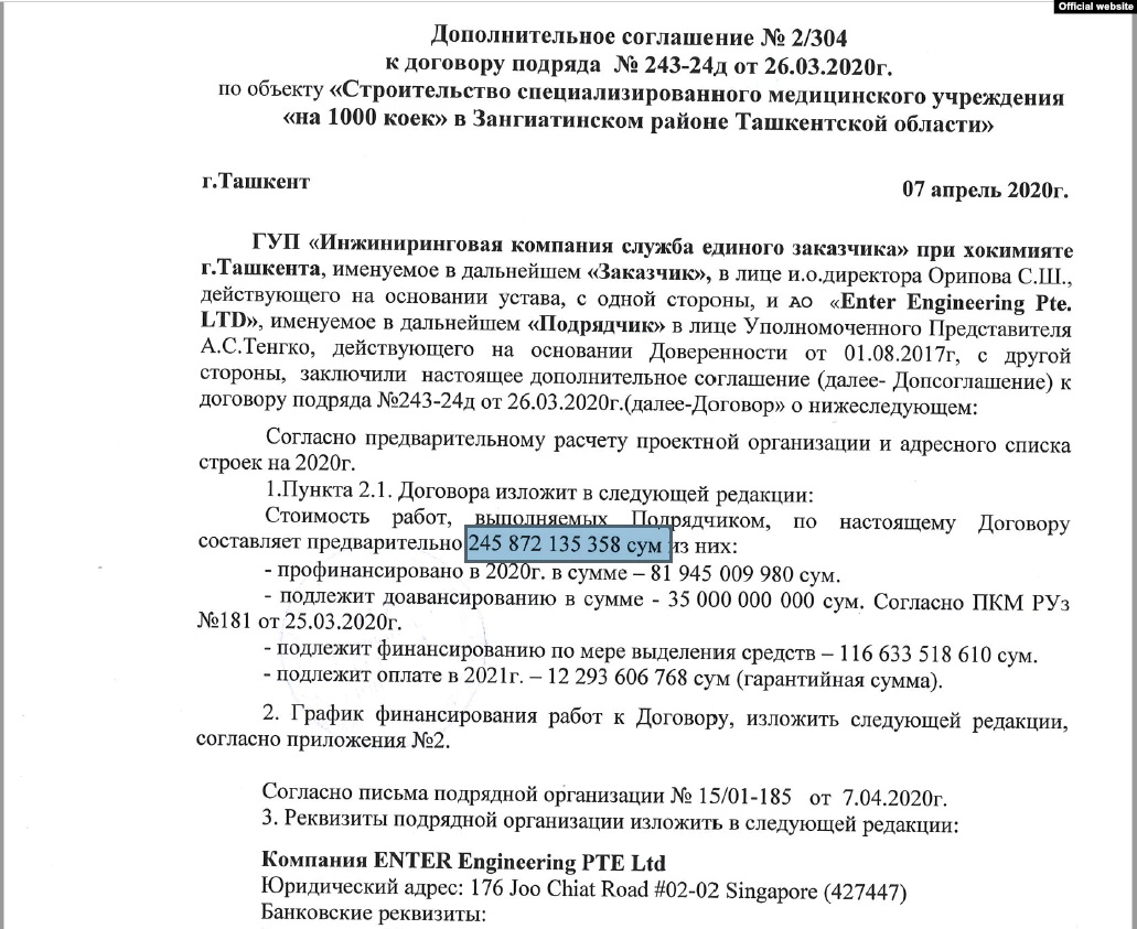 В дополнительном соглашении за №2/304, подписанном между Enter Engineering и УП «Ягона буюртмачи хизмати», стоимость строительства первоначальной части ковидной больницы на 1000 мест повышается в два раза – от 106 483 366 599 сумов до 245 872 135 358 сумов. Другие условия соглашения оставлены без изменений.