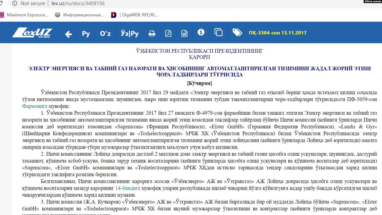 Этот документ подразумевает отмену президентом своего же постановления №3384 от 2017 года, и передачу производства электронных счетчиков газа без проведения тендера в руки ООО «Texnopark», вместо ранее объявленной немецкой компании.