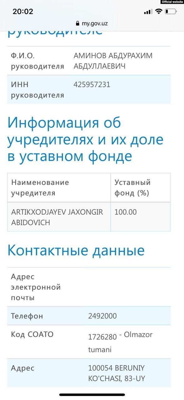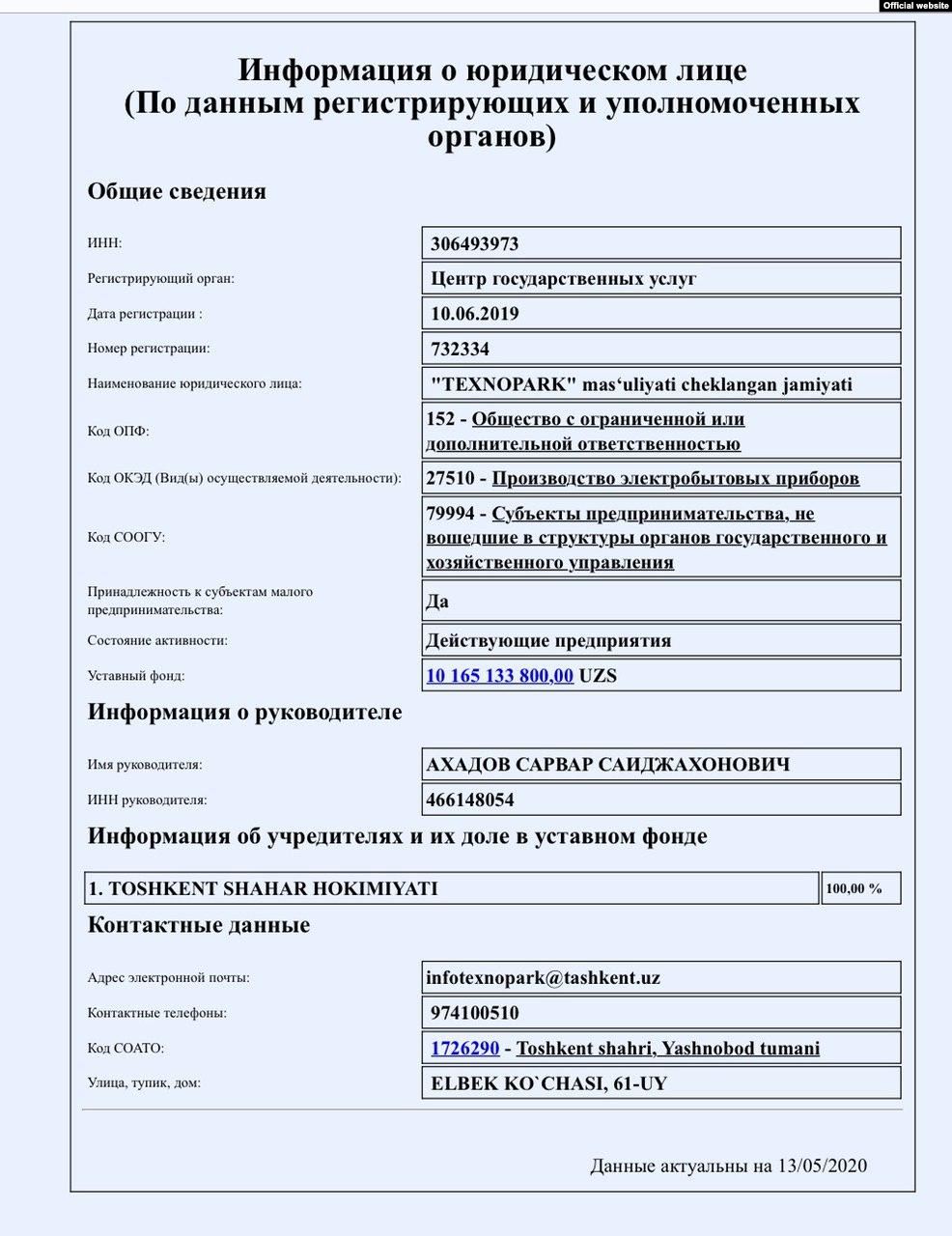 Согласно официальным регистрационным документам, данное ООО было зарегистрировано в Центре государственных услуг 10 июня 2019 года. Главой компании «по производству бытовой техники» с уставным фондом 10.165.133.800 сумов (1 миллион долларов США по текущему курсу – ред.) указан Ахадов Сарвар Саиджахонович.