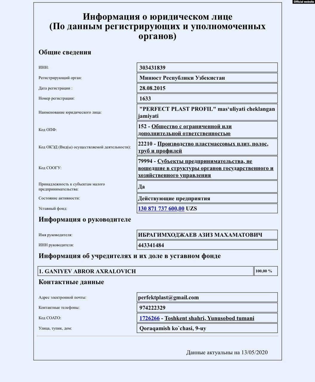 В регистрационном документе единственным собственником ООО «PERFECT PLAST PROFIL» с уставным капиталом 130.871.737.600 сумов (почти 13 миллионов долларов США по действующему курсу ЦБ – ред.) указан Ганиев Аброр Ахралович.