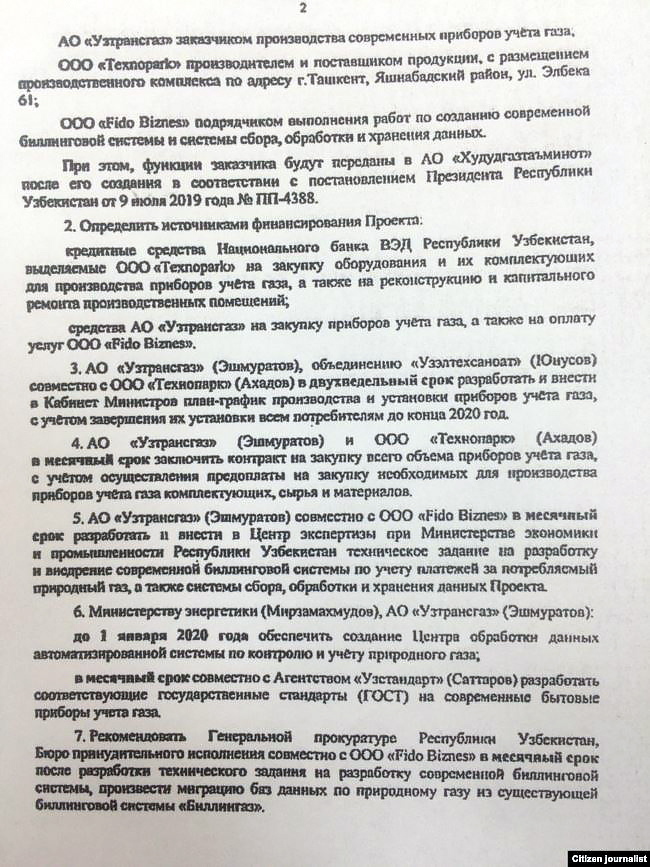 ООО «Texnopark», которое до сегодняшнего дня не выпустило ни одного газового счетчика, было выбрано в качестве производителя и поставщика 3,5 миллиона штук газовых счетчиков; создание биллинговой системы и системы сбора, обработки и хранения данных, согласно протоколу, было поручено ООО «Fido Biznes».
