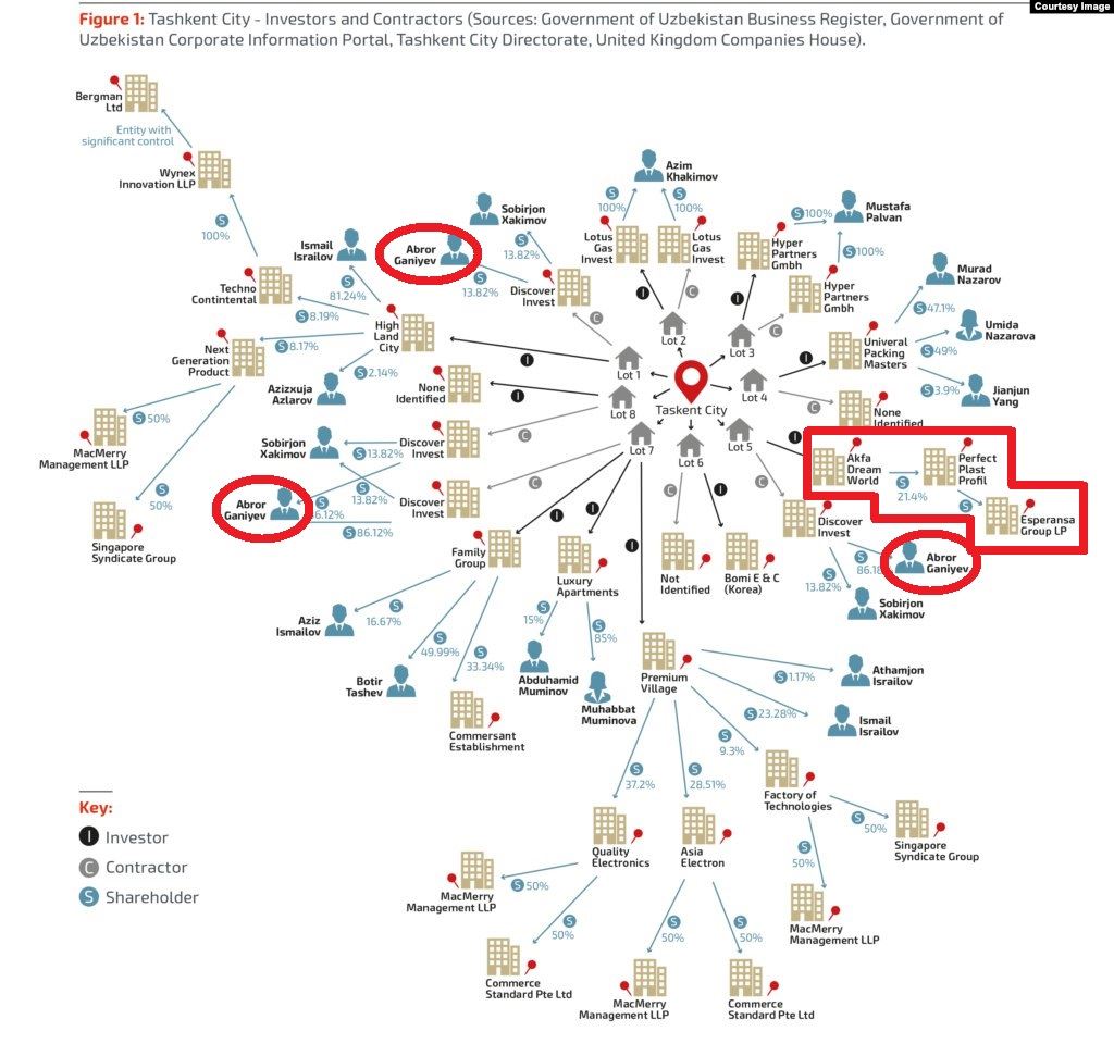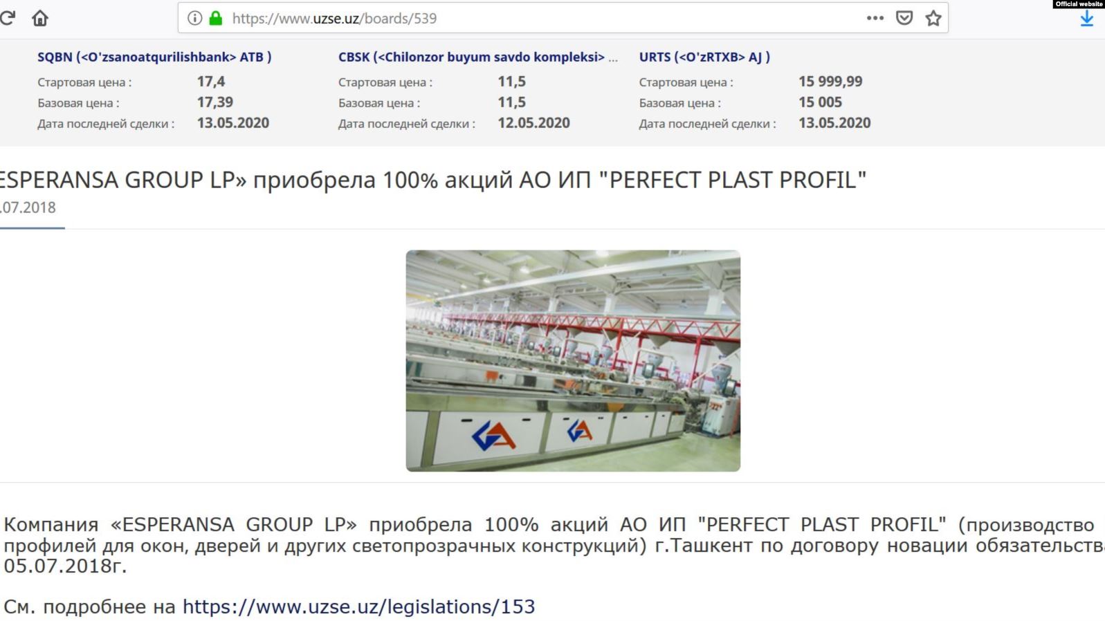 – В документах за февраль-март 2019 года владельцем основного пакета акций компании «Discover Invest» являлся Аброр Ганиев. В регистрационных документах указано, что «Discover Invest» и J-United Group находятся по одному и тому же адресу. А стопроцентным владельцем холдинга J-United Group является мэр Ташкента Джахонгир Артыкходжаев. Если говорить непосредственно об ООО «Perfect Plast Profile», то в прошлом году стопроцентным владельцем акций данного предприятия являлась зарегистрированная в Шотландии компания под названием Esperansa Group LP. Эта компания одна из десяти оффшорных компаний, входящих в состав холдинга Artel-Akfa. Кроме того, Esperansa является владельцем акций компании Wide Tent Systemе, которая тоже принадлежит Артыкходжаеву, – сказал 13 мая в разговоре с журналистом «Озодлика» Кристиан Ласслетт.