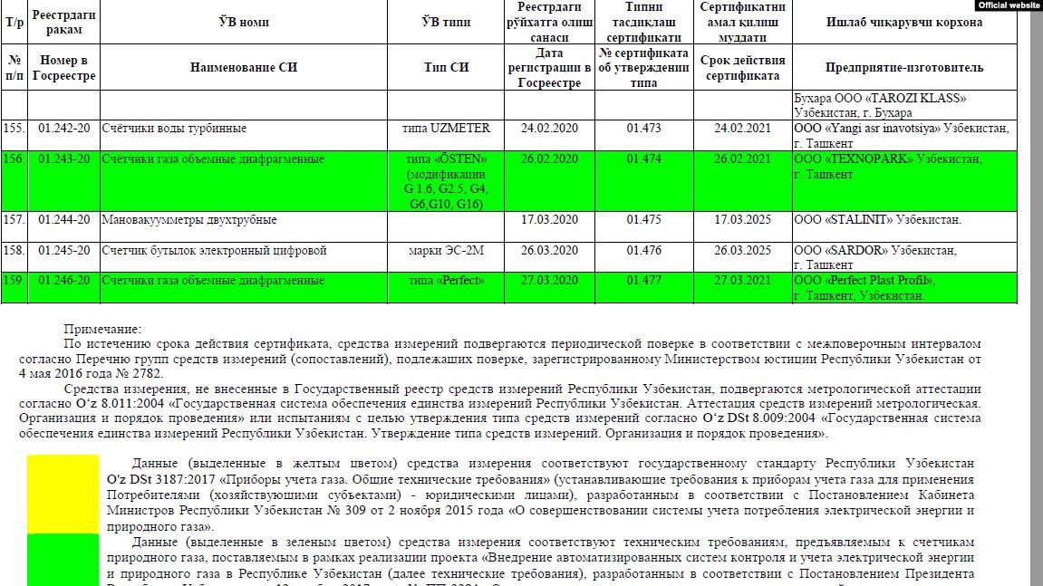 ООО «Perfect Plast Profile», признанный резервным победителем тендера стоимостью 555 миллионов долларов, был внесен в государственный реестр средств измерений Узбекистана 27 марта 2020 года – в последний день продленного тендера по госзакупкам газовых счетчиков.