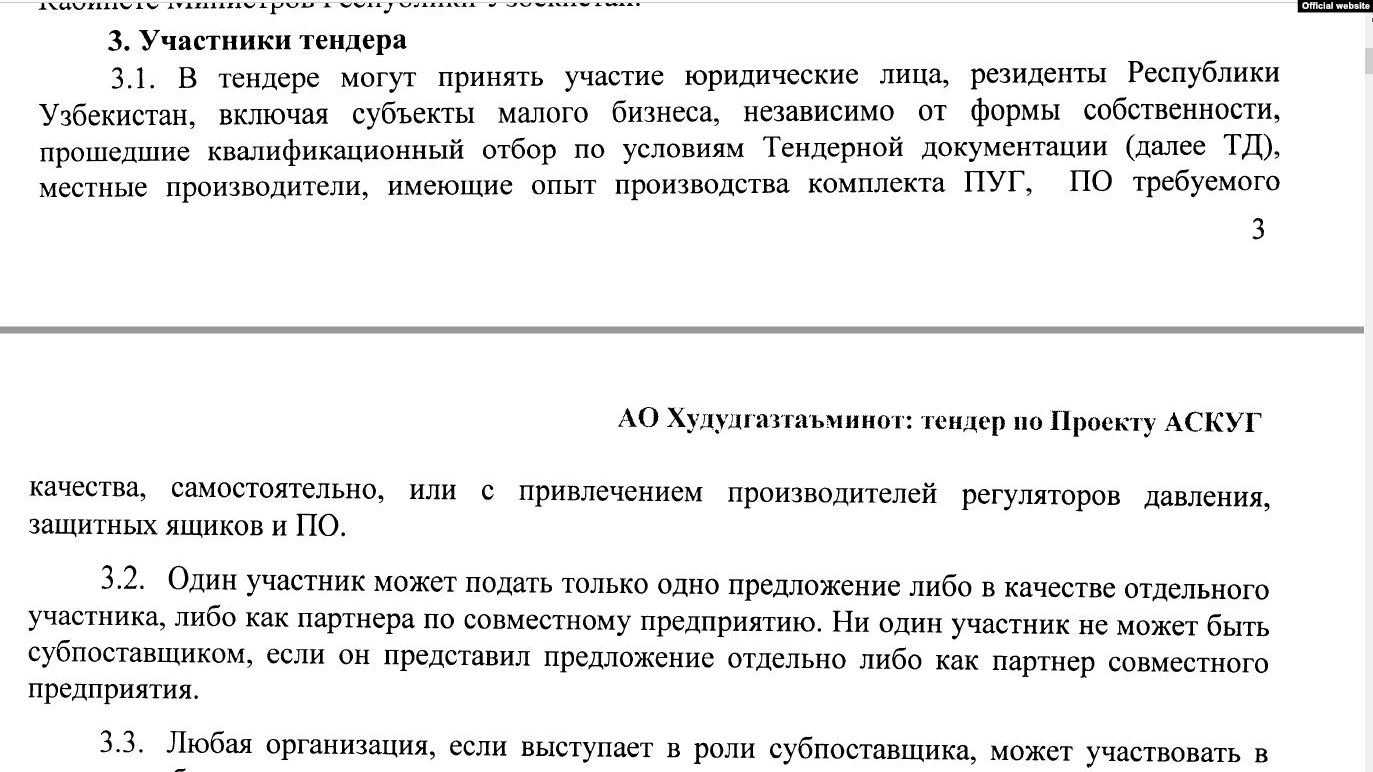 В первом пункте статьи 3 («Участники тендера») сказано, что в тендере может принять участие любое юридическое лицо, являющееся резидентом Узбекистана, независимо от формы собственности.