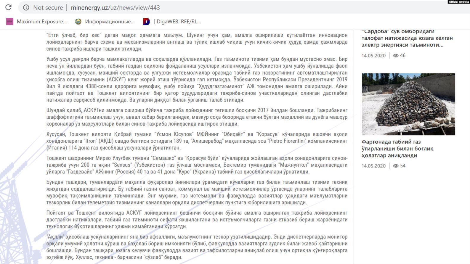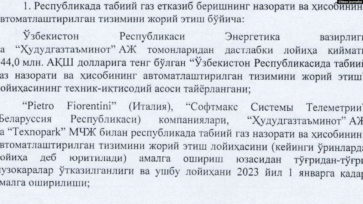 Однако после дискуссий между министерствами, в частности, после заключения Антимонопольного комитета Узбекистана от 3 октября (в распоряжении редакции «Озодлика» имеется копия заключения – ред.) о том, что проект постановления о внедрении автоматизированной системы контроля учета газа противоречит закону «О государственных закупках», Абдулла Арипов был вынужден приостановить реализацию проекта постановления.