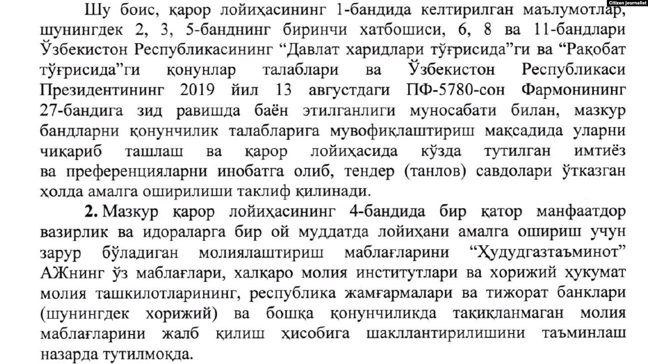 3. Срок тендера, как видно из документов, был продлен лишь для того, чтобы привести в порядок документацию двух вышеназванных ООО, о победе которых было известно еще до проведения тендера. Условия тендера были составлены также в интересах этих двух предприятий. Так как продленный срок тендера пришелся на период карантина (ограничения в стране были введены с 16 марта – ред.), введенного в Узбекистане в связи с пандемией коронавируса, заинтересованные в участии в тендере другие компании остались в неведении. 3 апреля, когда людям было запрещено выходить из дома, а государственным ведомствам рекомендовано перейти на дистанционную работу, тендерная комиссия «втихаря» вынесла решение о победителях. Даже спустя два месяца после принятия этого решения общественность не проинформирована об этом. Данное обстоятельство также противоречит карантинным правилам и закону «О государственных закупках», который направлен на обеспечение прозрачности при проведении тендеров и госзакупок.