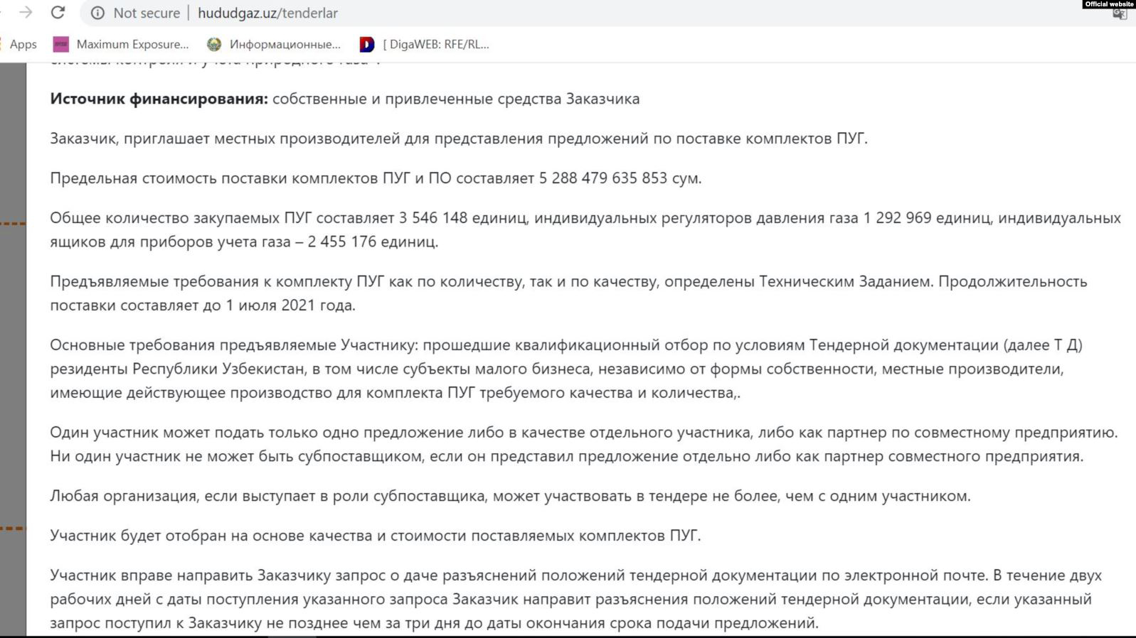 К этому объявлению (hududgaz.uz/tenderlar) приложены тендерная документация и список технических требований для госзакупок на русском языке.