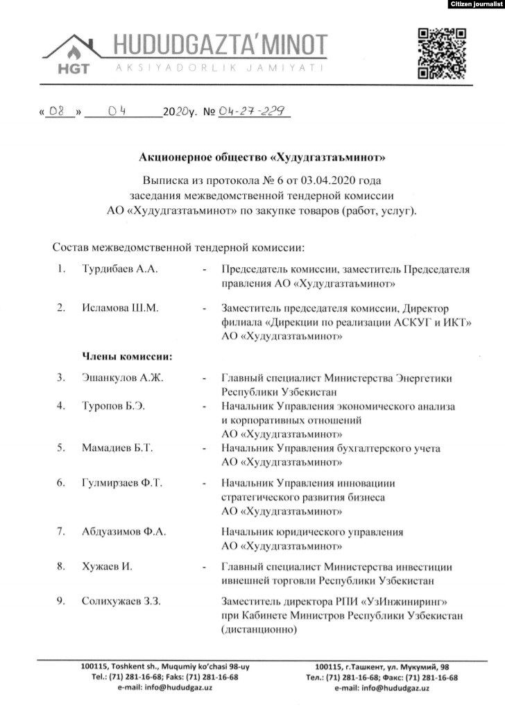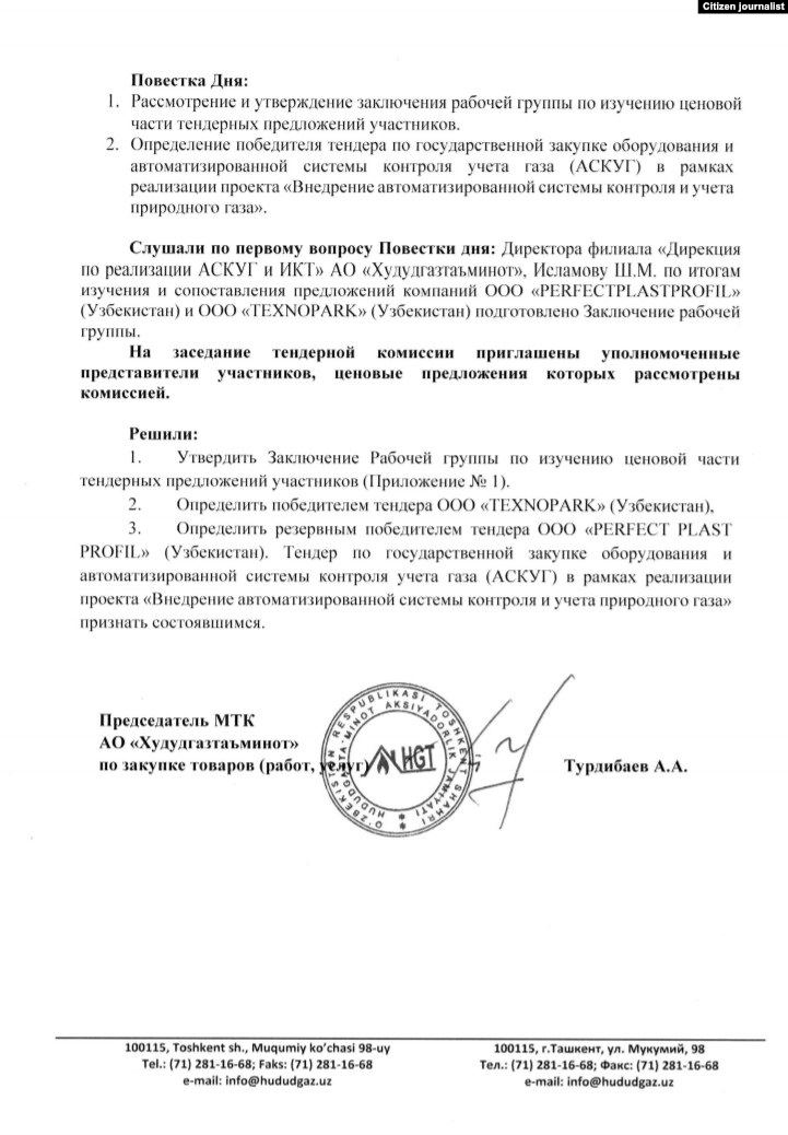 Согласно документу, копия которого имеется в распоряжении редакции «Озодлика», на заседании межведомственной тендерной комиссии, в состав которой вошли представители девяти министерств и ведомств, председательствовал заместитель председателя правления АО «Худудгазтаъминот» Алишер Турдибаев.