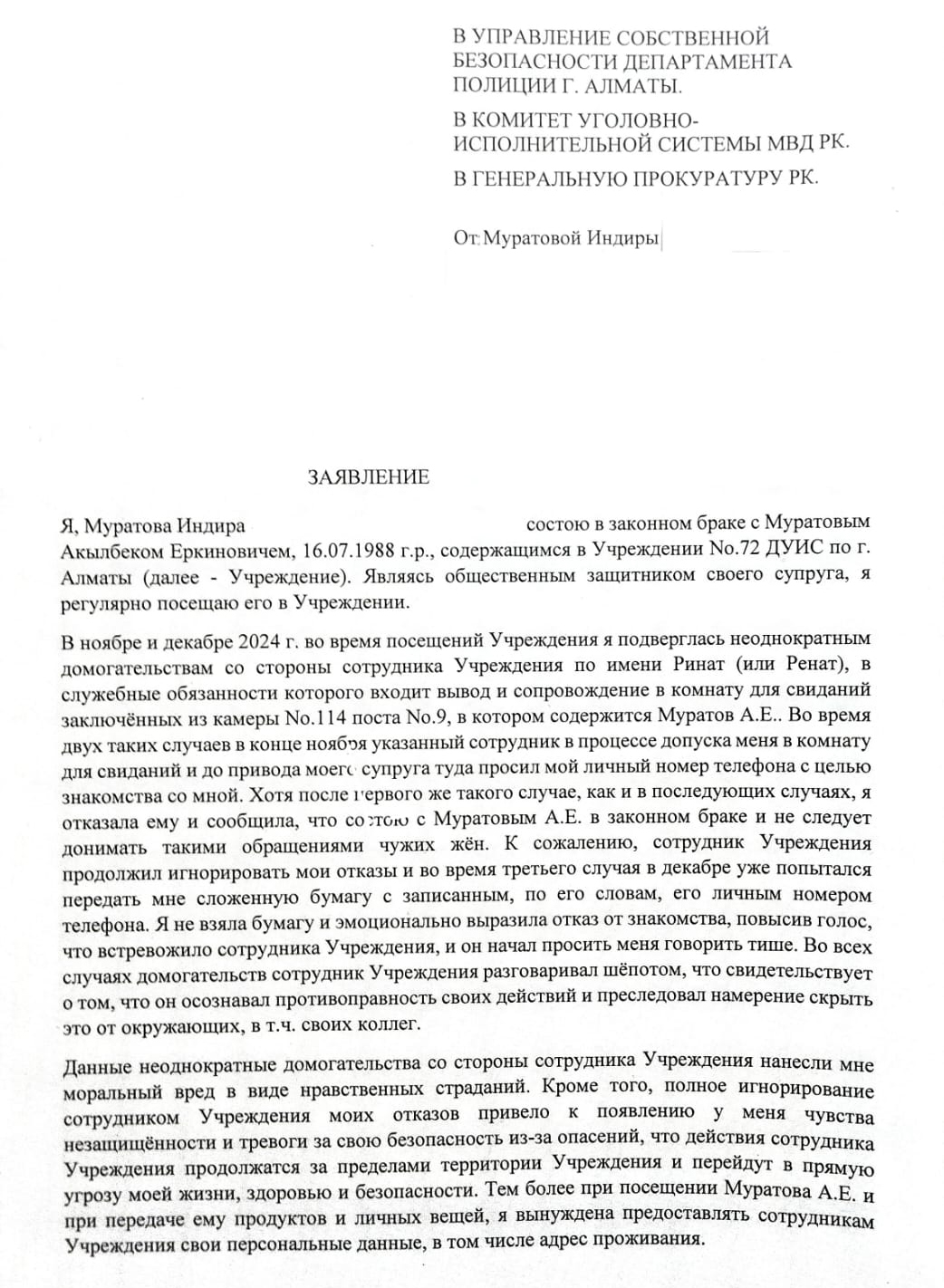 Напомним, Индира Муратова, жена Акылбека Муратова, уже более 11 месяцев содержащегося в следственном изоляторе г. Алматы, заявила, что во время посещения своего мужа подверглась неоднозначному интересу со стороны сотрудника изолятора по имени Ринат (или Ренат), в служебные обязанности которого входит вывод и сопровождение в комнату для свиданий заключённых из камеры №114 поста №9. Находящийся при исполнении сотрудник СИЗО, выводящий Муратова на свидания, неоднократно просил номер её телефона для дальнейшего знакомства, зная её семейное положение и игнорируя отказы.