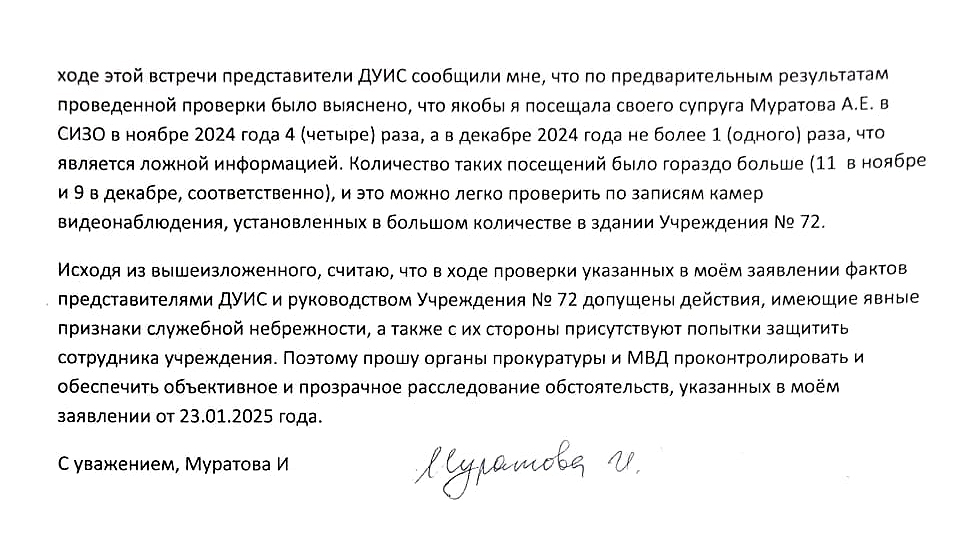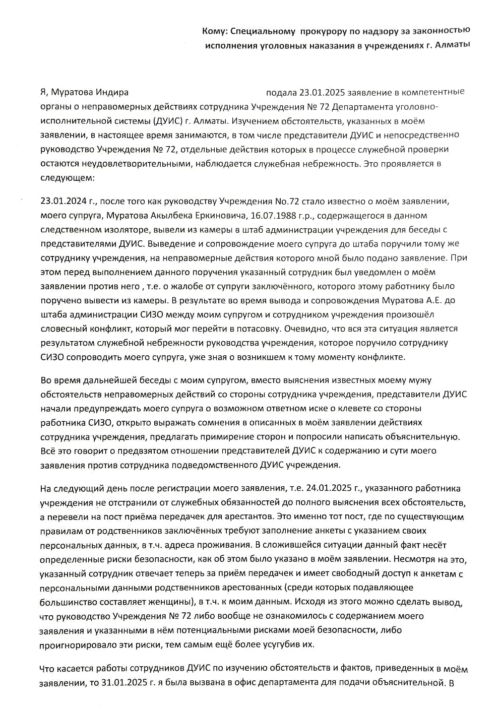 «Исходя из вышеизложенного, считаю, что в ходе проверки указанных в моём заявлении фактов представителями ДУИС и руководством Учреждения № 72 допущены действия, имеющие явные признаки служебной небрежности, а также с их стороны присутствуют попытки защитить сотрудника учреждения. Поэтому прошу органы прокуратуры и МВД проконтролировать и обеспечить объективное и прозрачное расследование обстоятельств, указанных в моём заявлении от 23.01.2025 года», - заключает она.