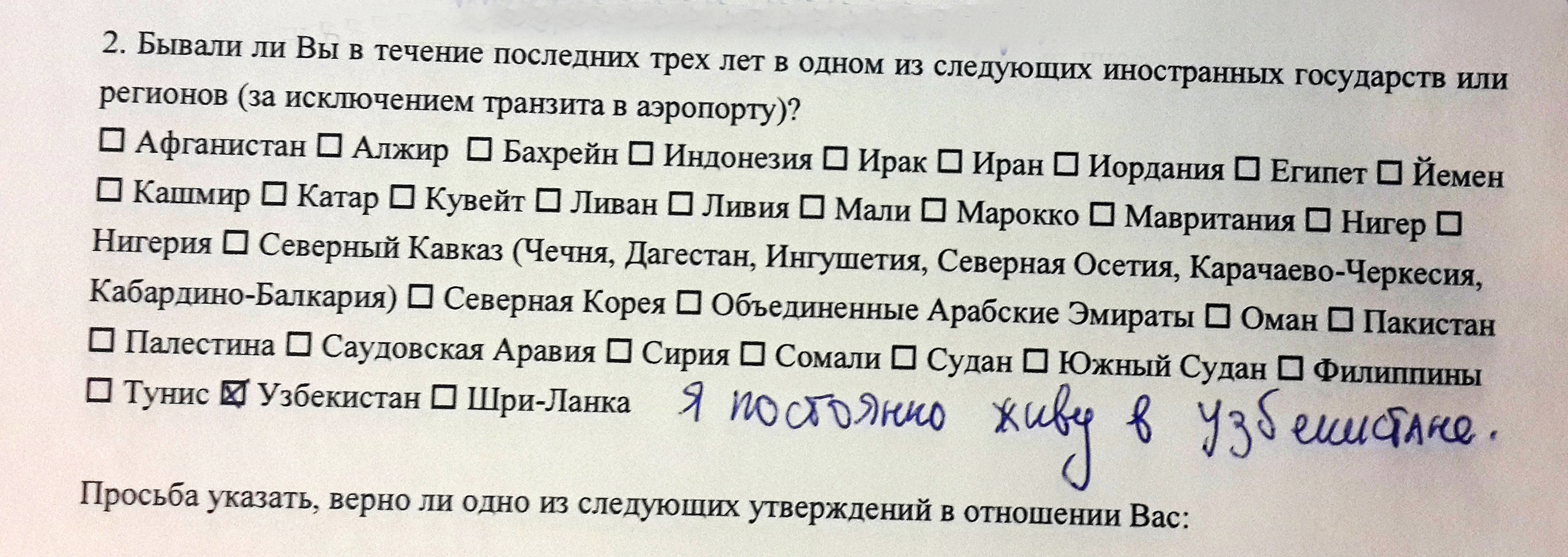 В анкете содержится список из 34 государств и регионов, пребывание в которых, по мнению её составителей, предполагает повышенный риск «заражения» идеями экстремистской и террористической направленности.