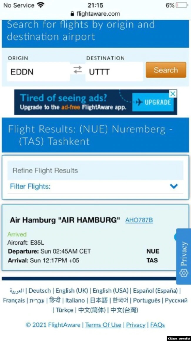Согласно информации сайта flightaware.com, отслеживающего полеты в режиме реального времени, самолет, принадлежащий частной компании Air Hamburg и выполнявший рейс AHO787B из немецкого города Нюрнберг, 14 февраля примерно в 12 часов 17 минут приземлился в международном аэропорту города Ташкента (после случившегося накануне дорожного инцидента с Умаровым) и находился здесь «в режиме ожидания» с 14-го по 15 февраля. Затем, вылетев 15 февраля из узбекской столицы в 6.00 ташкентского времени, «медицинский» борт произвел посадку в 8.13 (время московское) в московском международном аэропорту Внуково.