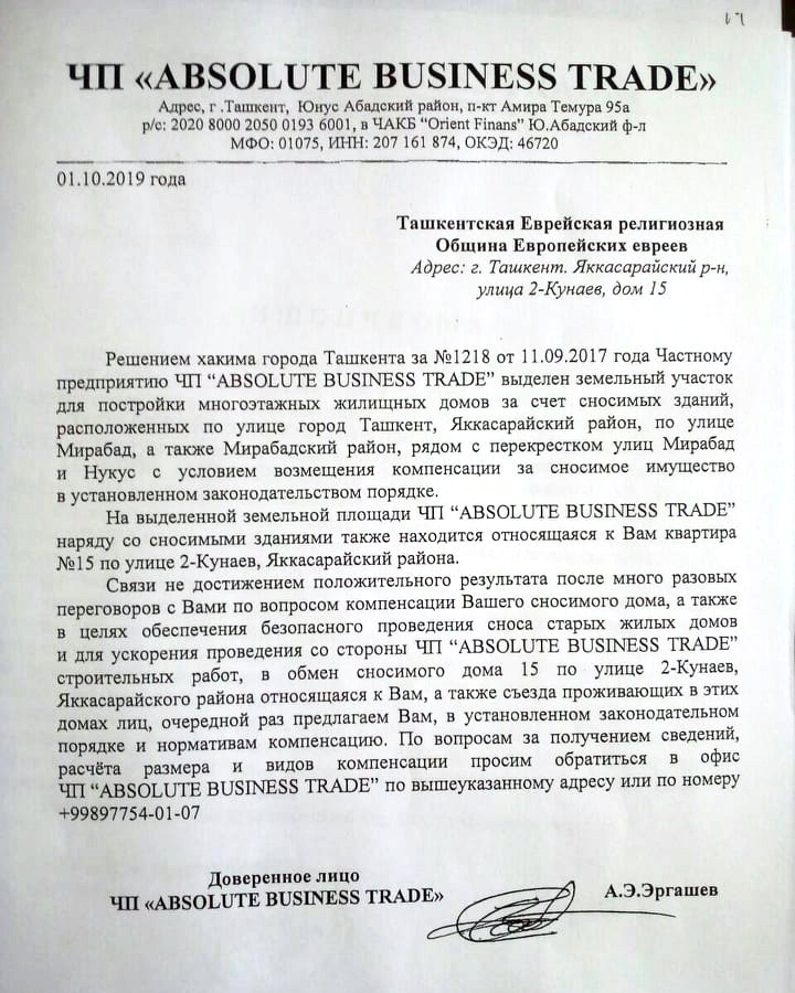 Напомним, что решением предыдущего хокима Ташкента Рахмонбека Усманова (ныне хоким Юнусабадского района) от 11 сентября 2017 года Absolute Business Trade получила в «подарок» 6 гектаров земли со стоящими на ней частными домами для строительства комплекса многоэтажных домой с объектами торговли и услуг на первых этажах на пересечении улиц Мирабад (бывшая Сапёрная) и Нукусская. (Подробнее об этом проекте – здесь).