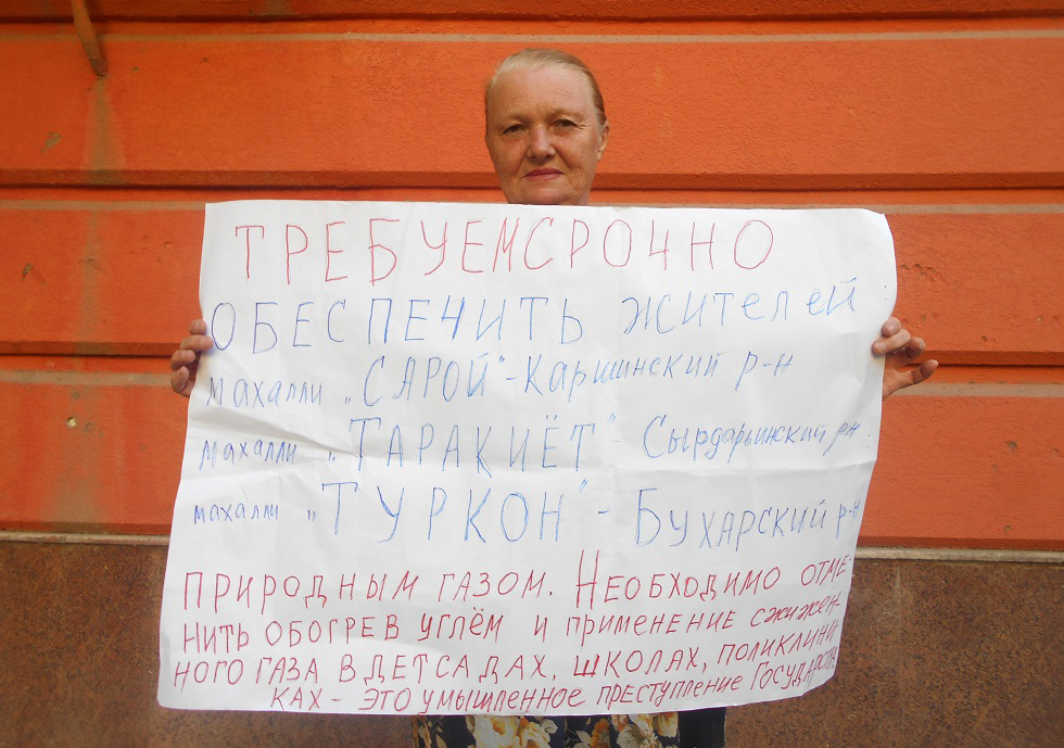 5 октября правозащитница Елена Урлаева провела пикет возле здания Кабинета министров Узбекистана с плакатом «Требуем срочно обеспечить жителей махалли «Сарой» в Каршинском районе, махалли «Тараккиёт» в Сырдарьинском районе, махалли «Туркон» в Бухарском районе природным газом. Необходимо отменить обогрев углём и применение сжиженного газа в детсадах, школах, поликлиниках – это умышленное преступление государства».