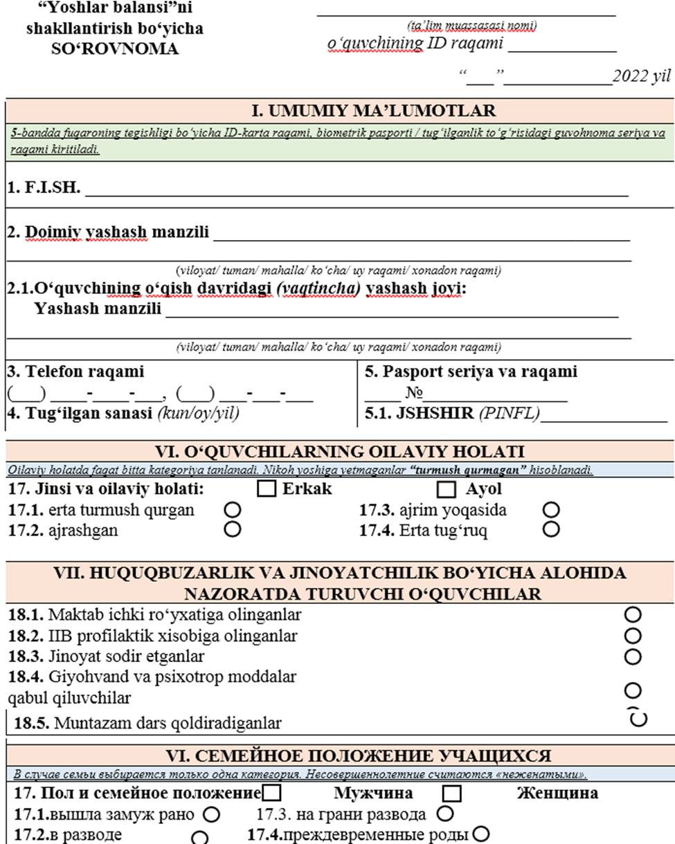 В перечне личных сведений требуется указать, кроме обычных ФИО, национальности, телефонных номеров, адресов по месту проживания и прописке, паспортных данных, включая персональный идентификационный номер физического лица (ПИНФЛ), также ИНН. А самый интересный пункт – имелись ли когда-либо у несовершеннолетней девочки-школьницы «прерванная беременность» или «ранний развод».
