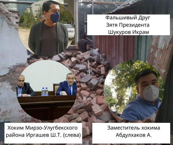 «Взбешенные сопротивлением местных «людишек» хоким района Иргашев Ш.Т., его заместитель Абдулхаков А. и фальшивый «друг зятя президента» Шукуров Икрам, вероятно, решили перейти к гангстерским методам», - утверждает гражданский активист
