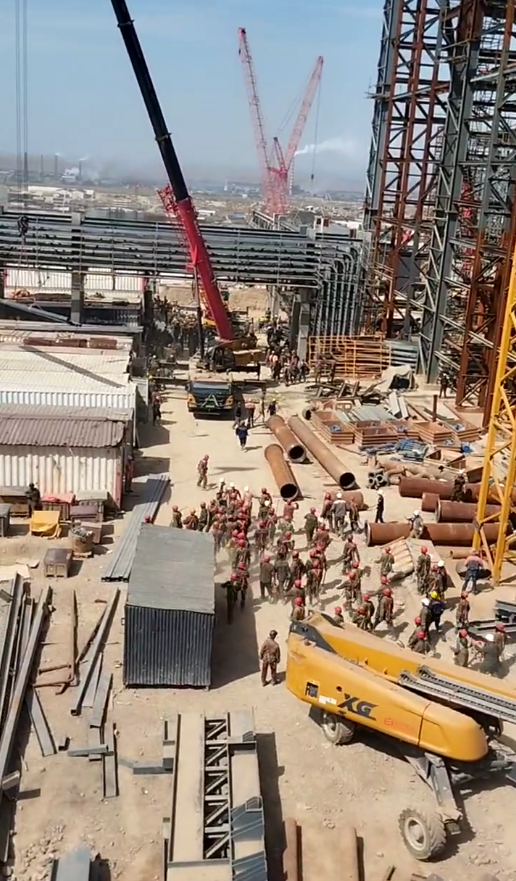 Телеграм-канал Эльтуз выложил несколько видео происходящих событий, на которых видно, как масса строителей вдруг начинает куда-то стремительно двигаться (кадров самих столкновений нет).