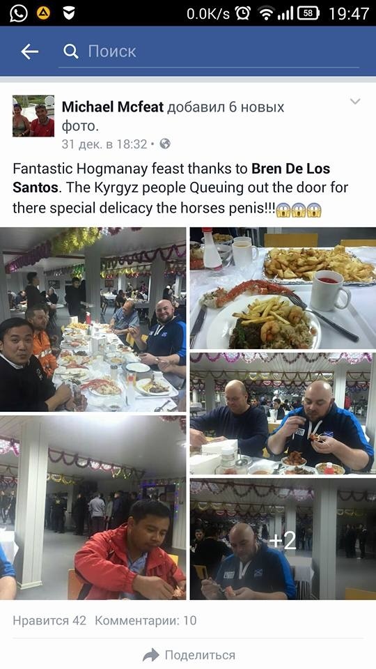Вечером 31 декабря на своей страничке в Facebook он оставил запись следующего содержания: «Фантастический канун Нового года благодаря Брен де лос Сантосу (сотрудник «Кумтора» - ред.). Киргизы выстроились в очередь даже за дверью за особым местным деликатесом - конскими пенисами».