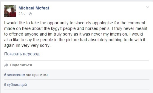 Следует отметить, что Макфит уже удалил свой пост, и написал новый, где попросил прошения: «Я хотел бы воспользоваться возможностью, чтобы искренне извиниться за свое сообщение о киргизах и лошадиных пенисах. Я действительно не хотел никого оскорбить этим и мне действительно жаль, что это случилось».