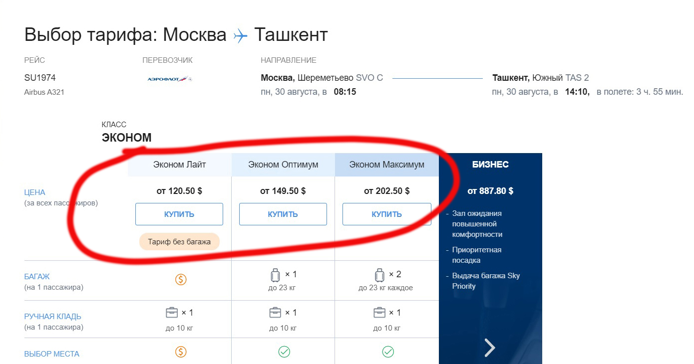 Аэрофлот. Стоимость билетов на рейсах из Москвы в Ташкент