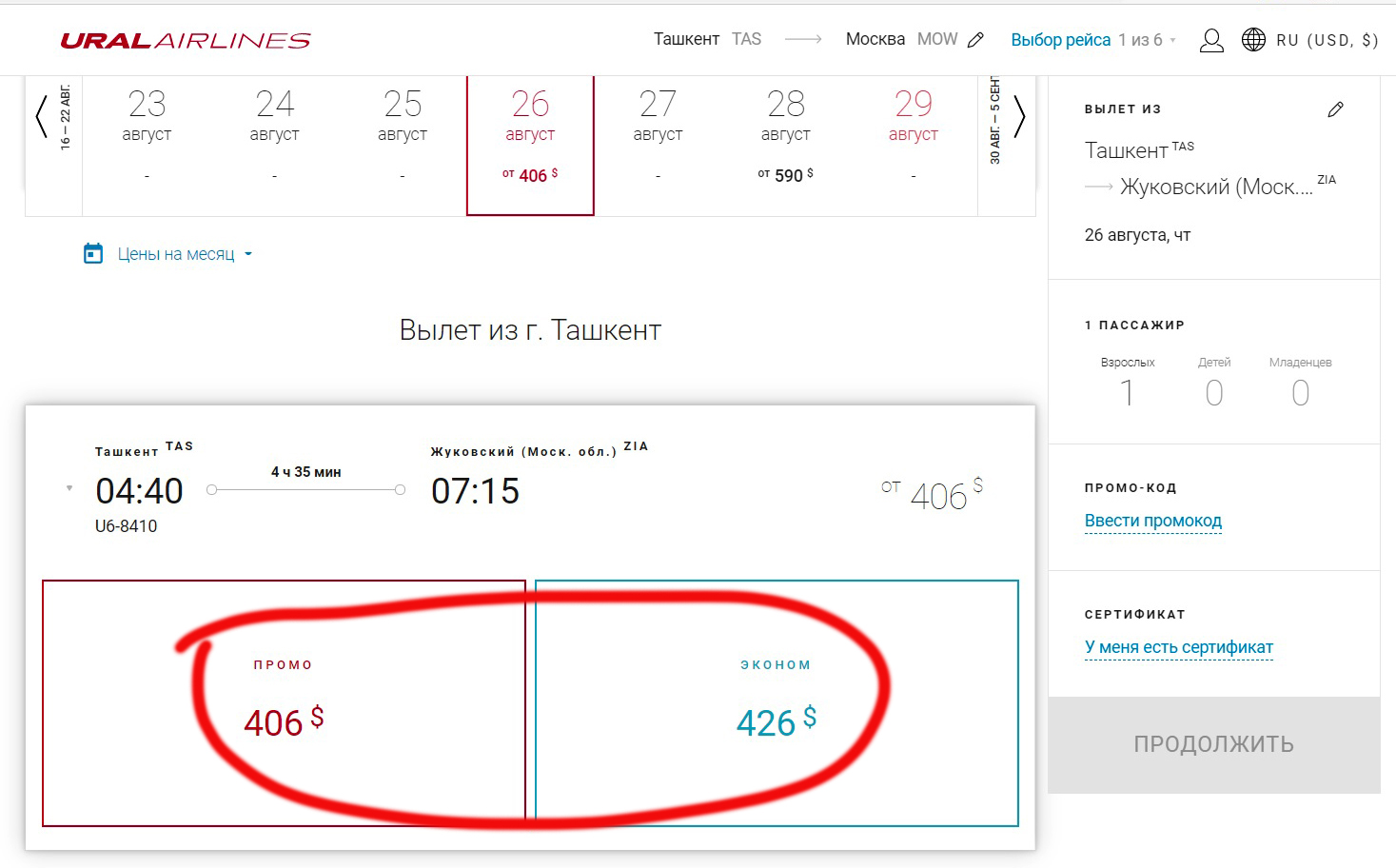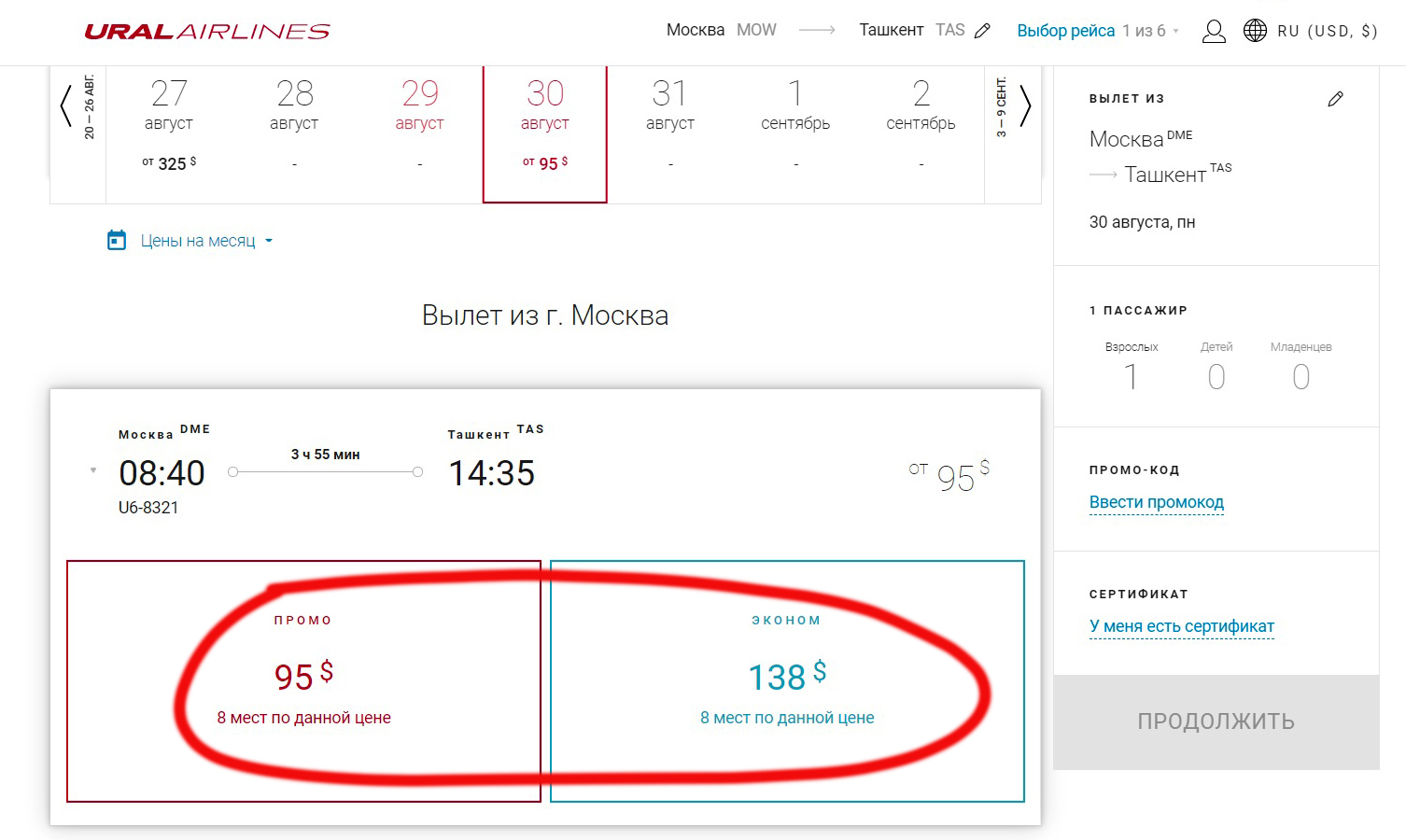 Уральские авиалинии. Стоимость билетов на рейсах из Москвы в Ташкент
