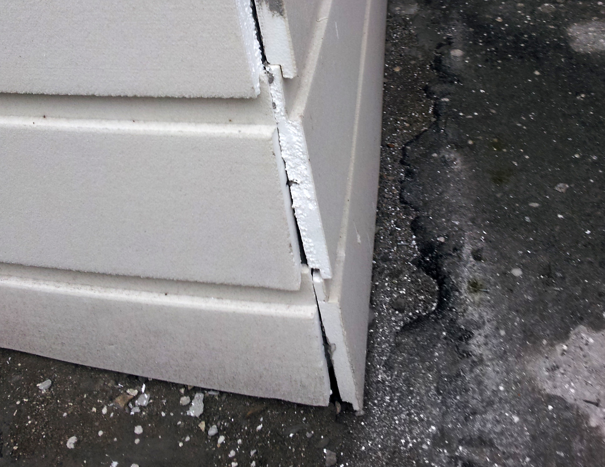 Жители заметили, что в наружной отделке зданий вдоль означенной «трассы» широко применяется материал, внешне и внутренне напоминающий обыкновенный пенопласт, на котором при надавливании даже остаются следы от пальцев. Из пенопласта к окнам жилых домов приделали некое подобие наличников.