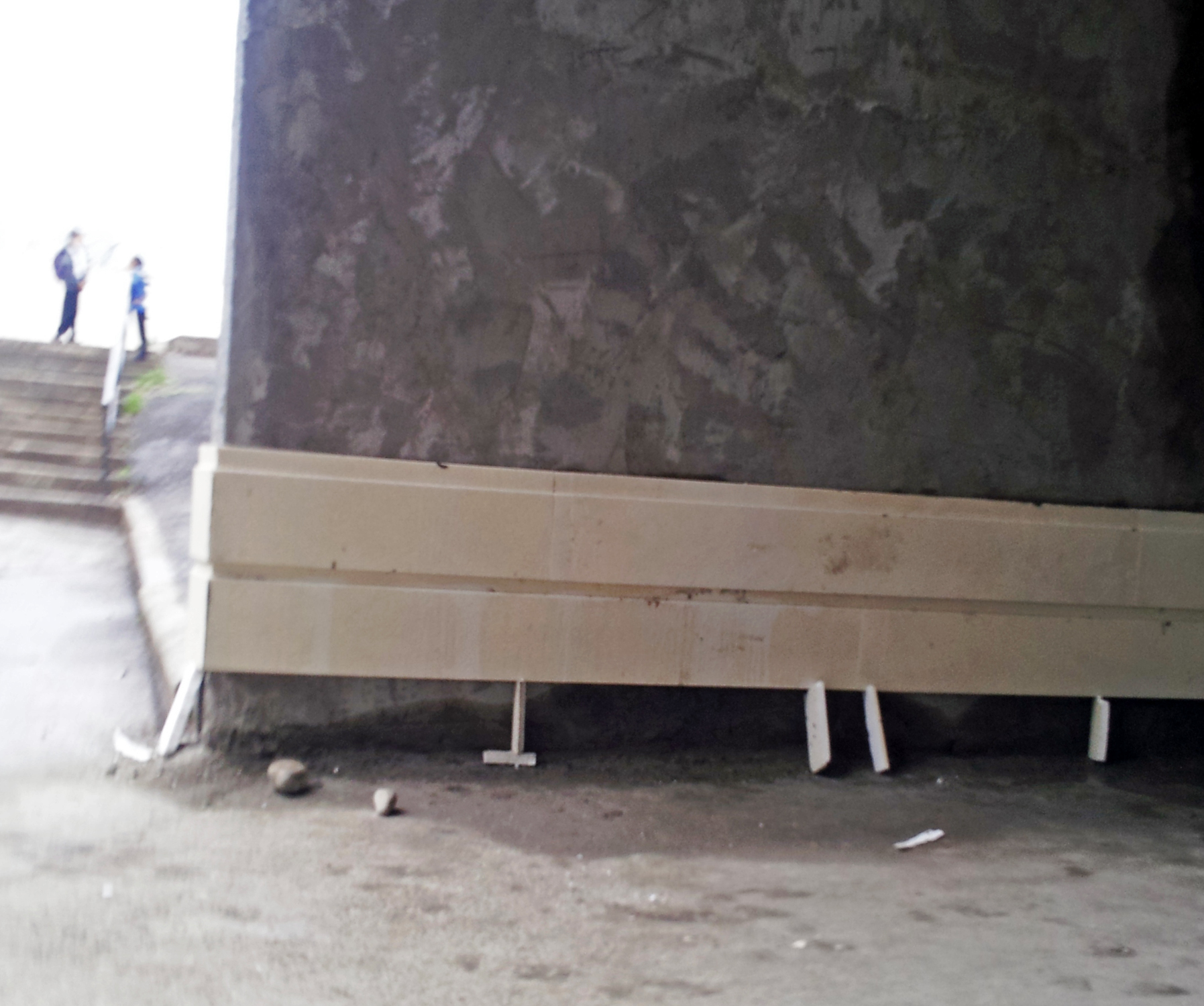 Также не дело простых граждан беспокоиться о том, как будут вести себя такие хрупкие на вид материалы в такой агрессивной среде, как опоры железнодорожного моста. Вероятно, пенопласт, гипс, клей и алюкобонд – самое то, чтобы выдерживать сильнейшие вибрации от поездов сверху и от машин снизу, огромные весовые нагрузки товарняка и пассажирских поездов, выхлопные газы автомобилей, скапливающиеся в рельефе, понижающемся под мостом…