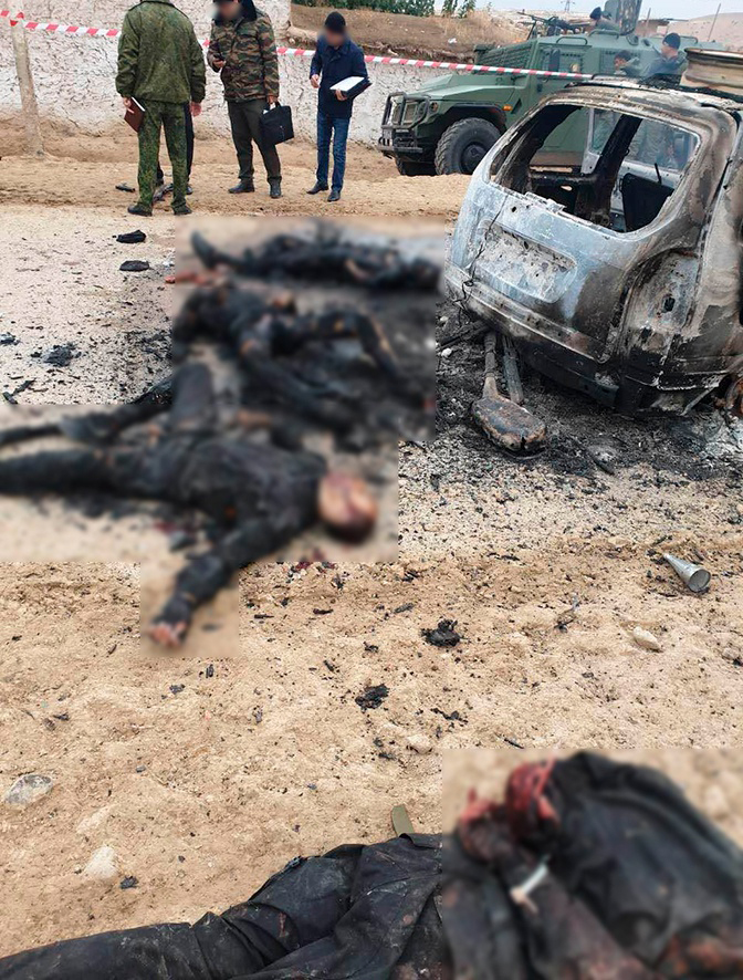 МВД Таджикистана опубликовало кадры с места нападения на погранзаставу. На фотографиях видны последствия ночного нападения, тела нападавших и пострадавшие автомобили, на которых, предположительно, приехали боевики: у одного из них деформирован кузов, второй же сгорел дотла. Вокруг места столкновения разбросаны оружие и большое количество различных мелких предметов.