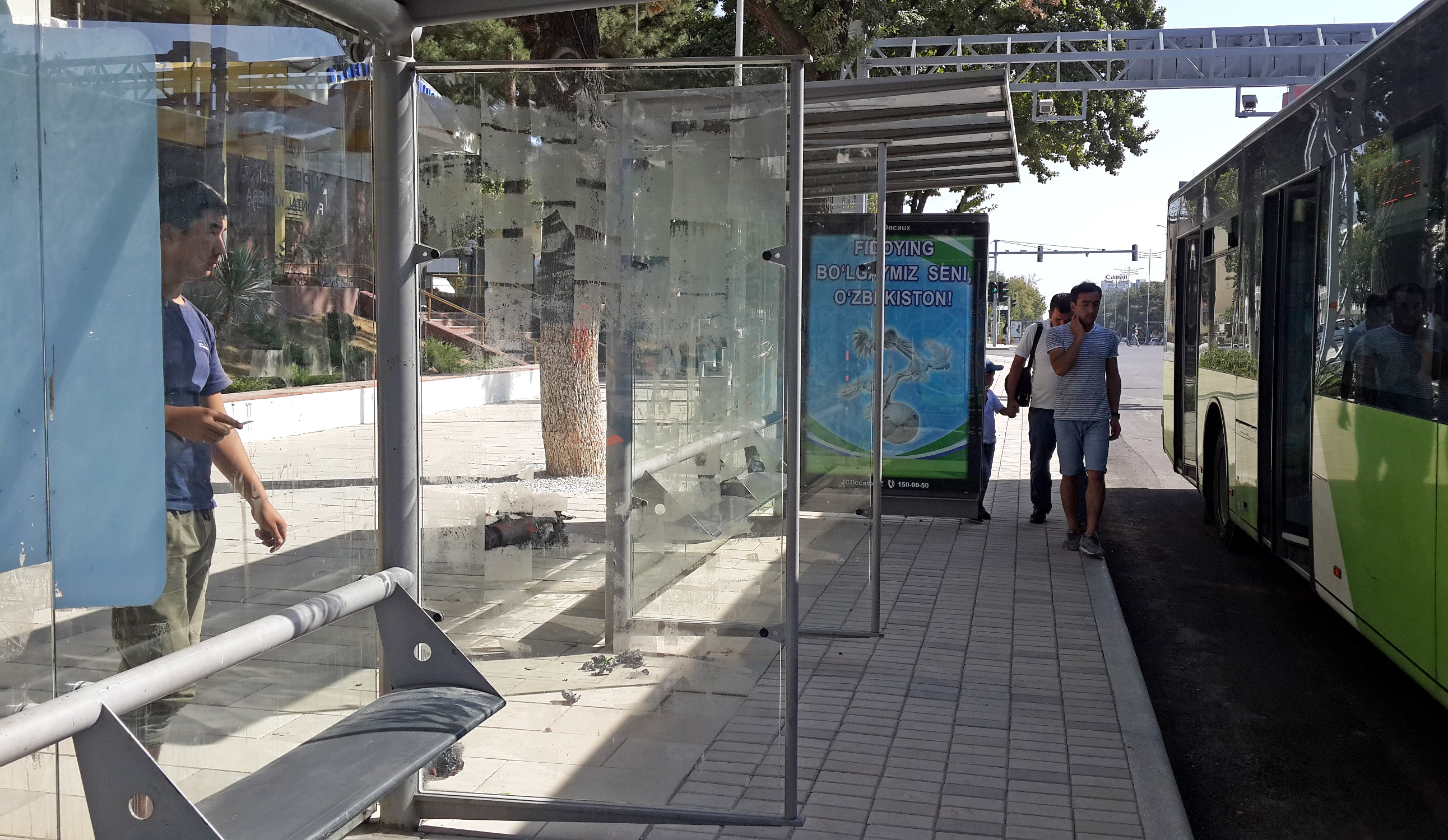 И всё бы прекрасно, да вот закавыка: от сильного летнего зноя эти остановочки не защищают, поскольку пронизываются солнечными лучами насквозь. Попросту говоря, живущим в Ташкенте людям они совершенно не нужны, и по-хорошему, их надо разобрать и выбросить. Если кто и получает от них прибыль, так это сама JCDecaux, да чиновники столичной администрации.
