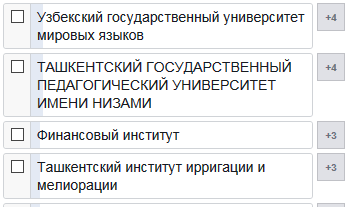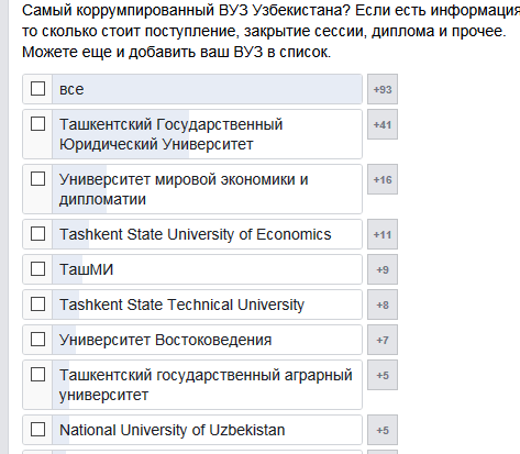 После этого инициаторы опроса решили докопаться до самых истоков и попытались выяснить, в каких учебных заведениях вымогают и берут больше всего. Пальма первенства была присуждена Ташкентскому государственному юридическому университету.