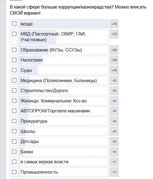 Далее они обозначили те области, с коррупцией в которых им приходится сталкиваться чаще всего. Это, как выяснилось, в основном, система МВД: паспортные столы, ОВИРы, ГАИ и участковые. За ней следуют сфера образования и налоговые инспекции.