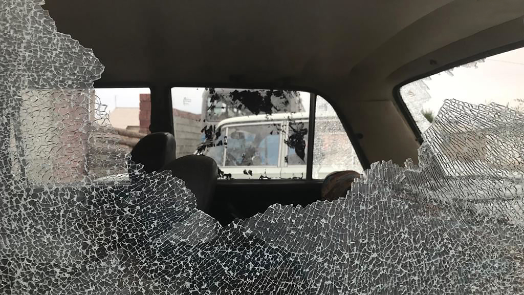 Автомобиль с разбитыми окнами в селе Шорнак. Туркестанская область, 23 июля 2020 года. Фото Дилары Исы