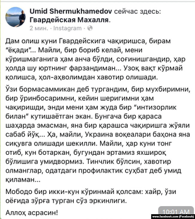 Пост Умида Шермухамедова в Фейсбуке