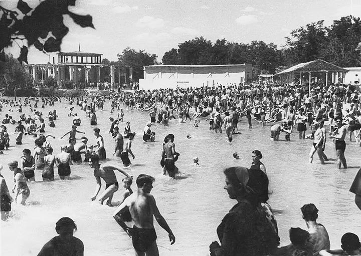Пляж на Комсомольском озере в Ташкенте, конец 1950-х-начало 1960-х. Разместил в интернете Борис Пономарев