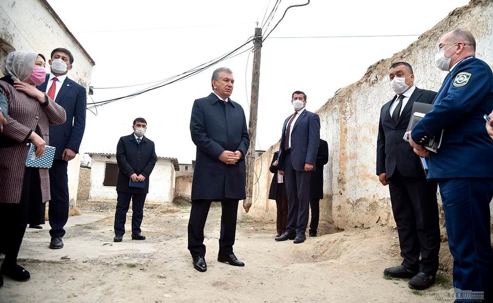 На фотоснимке, который обошел весь узбекский сегмент интернета, Шавкат Мирзиёев, в окружении целой толпы телохранителей и чиновников стоит (привычно без маски – вопреки всем остальным) стоит на одной из неухоженных махаллинских улочек, где расположены строения с обшарпанными глиняными стенами (напоминают дореволюционные кадры). Из «народа» рядом – разве что преданная властям председательница махаллинского комитета. Остальных жителей улицы, видимо, загнали в дома.