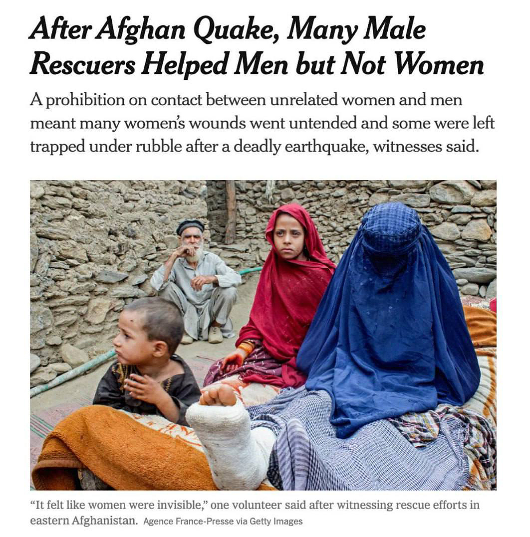 В публикации говорится, что из-за строгих норм «Талибана», запрещающих любой физический контакт между мужчинами и женщинами, не являющимися членами семьи, спасатели игнорировали женщин, оказавшихся под завалами.
