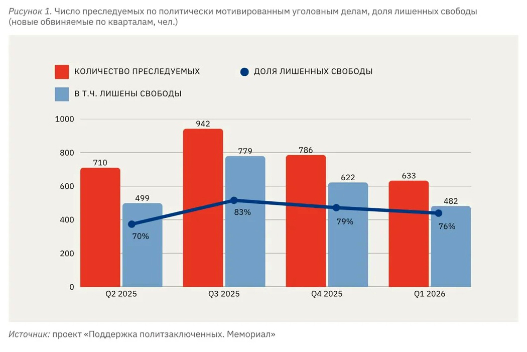 Правозащитники отмечают, что начиная с прошлого года силовики ежеквартально возбуждают около 500 политически мотивированных дел, на протяжении последних трёх кварталов неизменной остаётся и доля лишённых свободы.